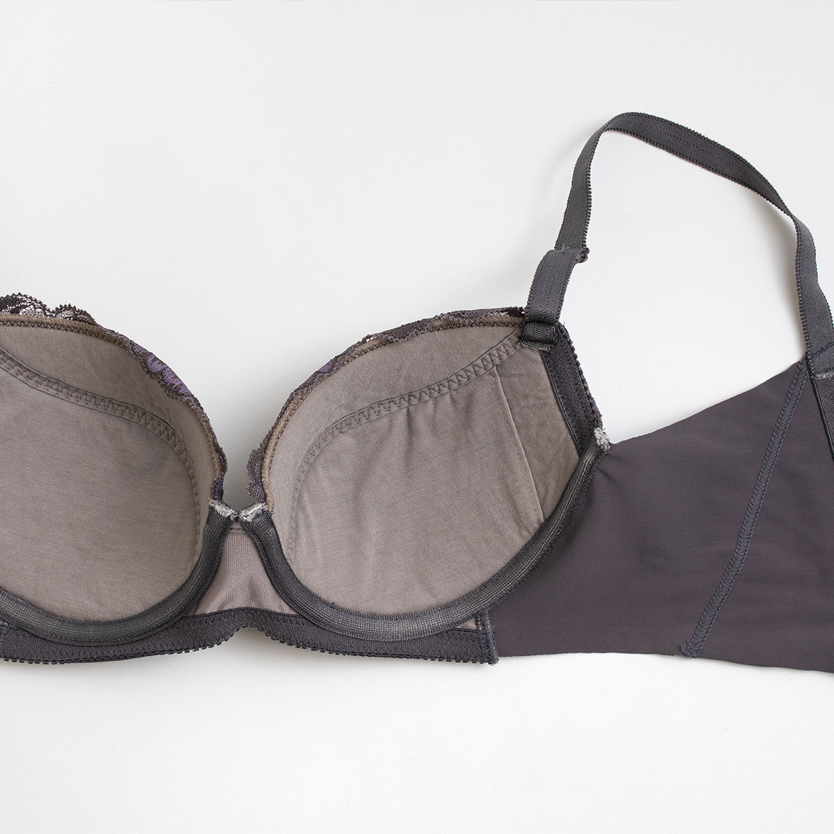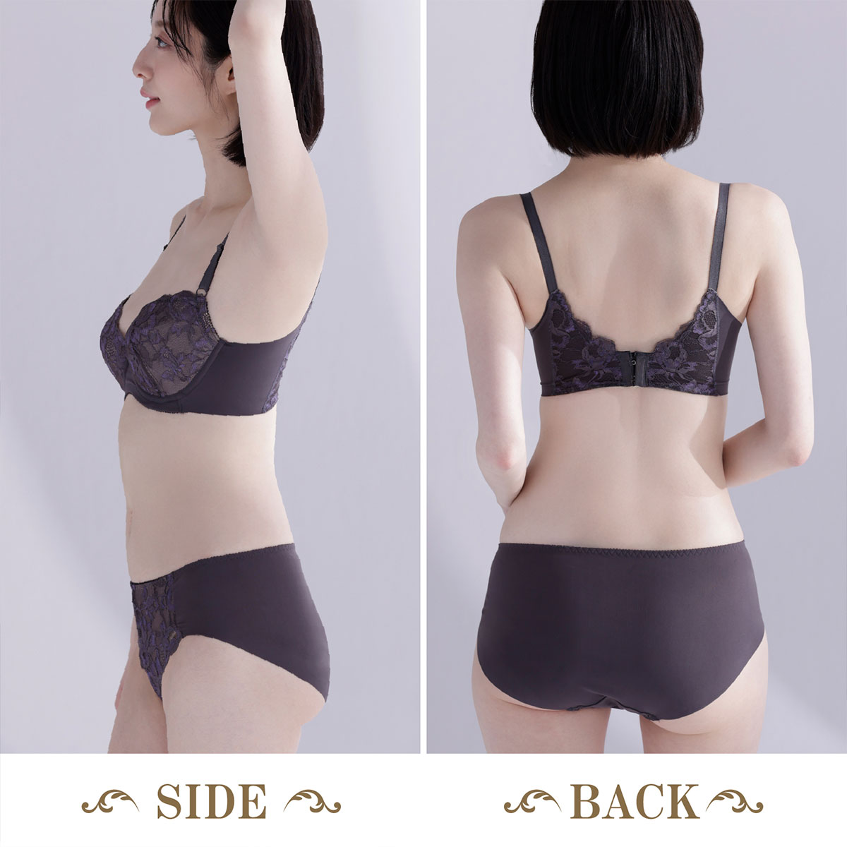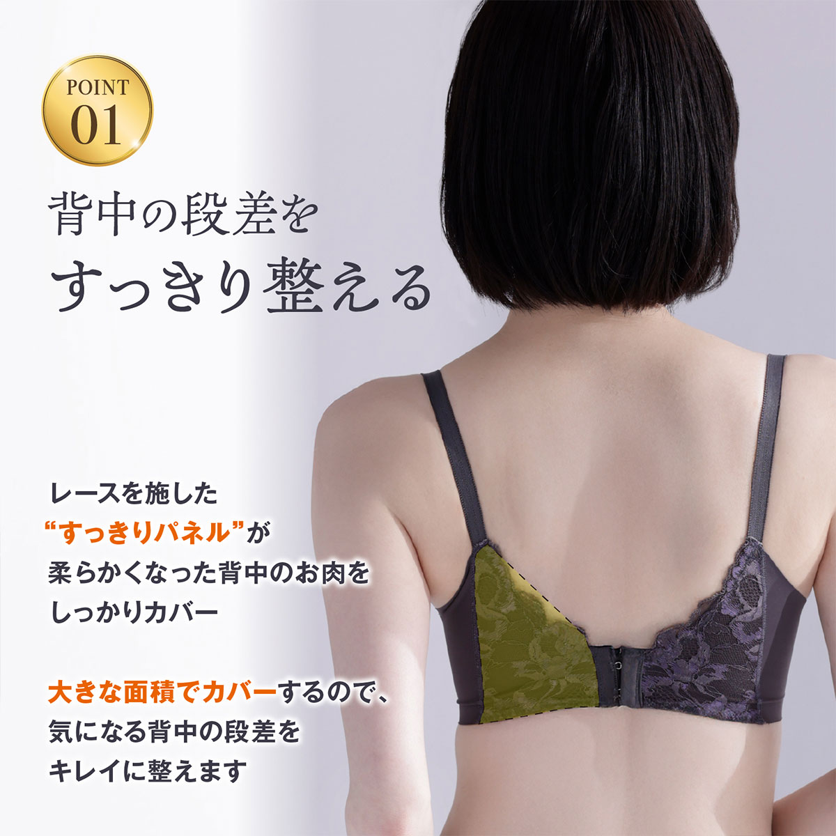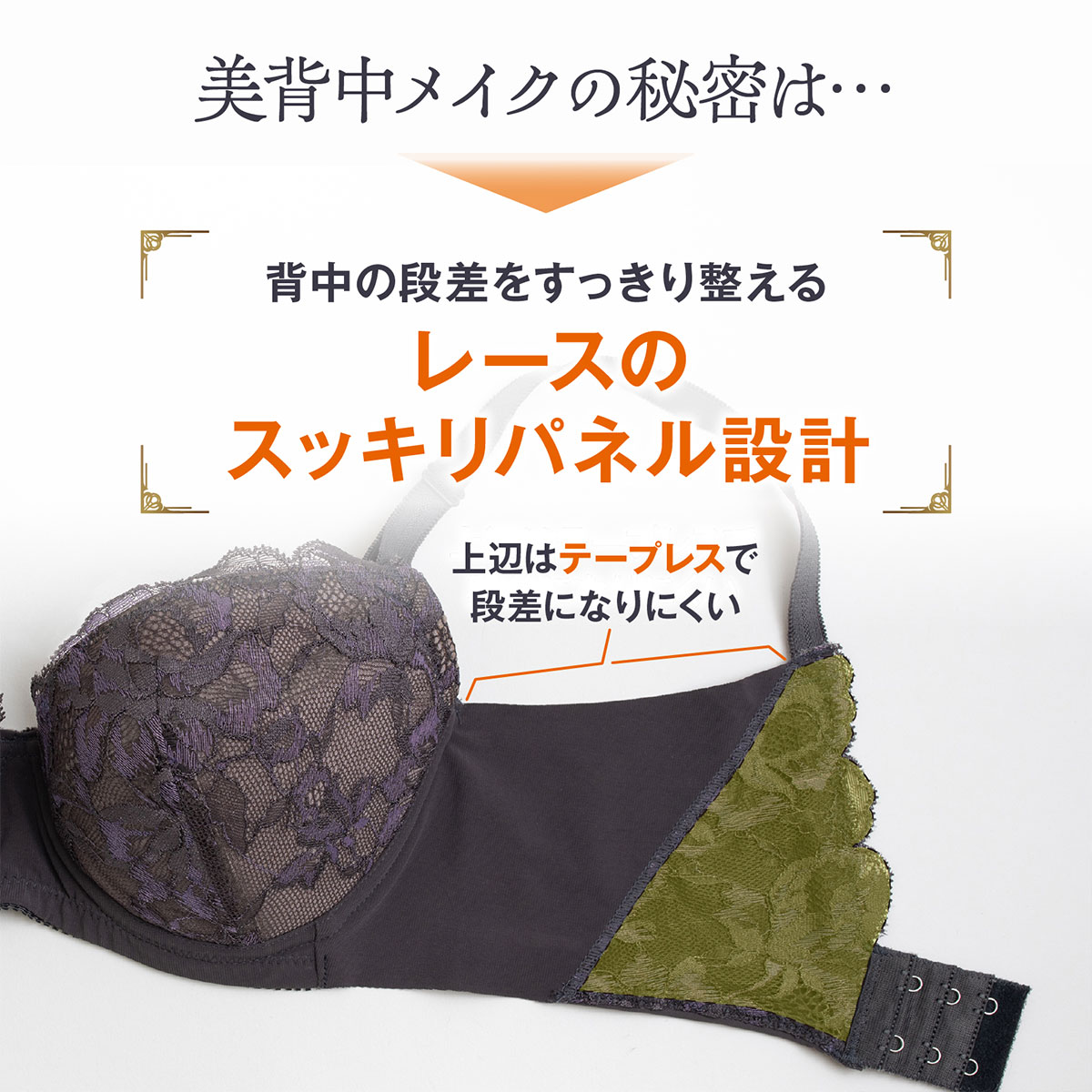 カップはバスト全体をすっぽり優しく包み込みながら、脇側をすっきり持ち上げる4/5カップ。安定感があり見た目をすっきりと整えます。バックは幅広・脇高設計のパネルで背中のお肉を押さえ、なめらかに整えます。上辺は切りっぱなし仕様なので、肌に食い込みにくく、なめらかな美背中を演出します。