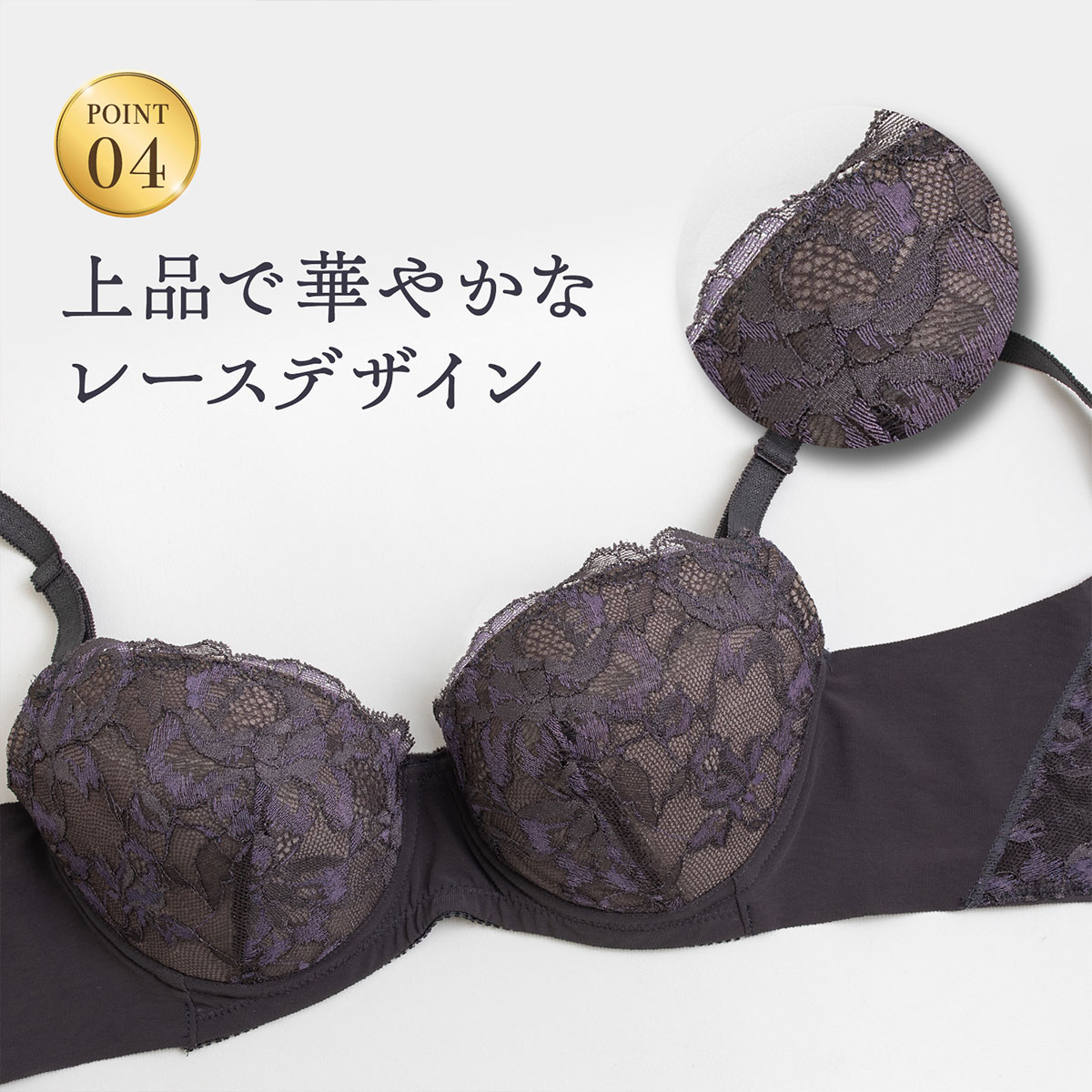 カップはバスト全体をすっぽり優しく包み込みながら、脇側をすっきり持ち上げる4/5カップ。安定感があり見た目をすっきりと整えます。バックは幅広・脇高設計のパネルで背中のお肉を押さえ、なめらかに整えます。上辺は切りっぱなし仕様なので、肌に食い込みにくく、なめらかな美背中を演出します。