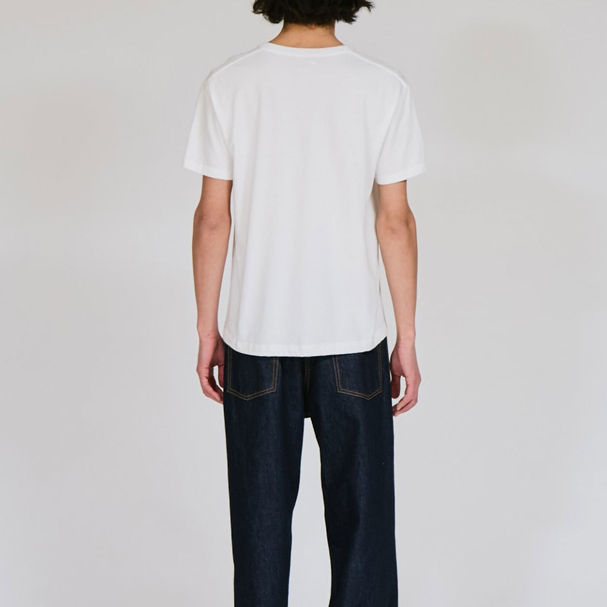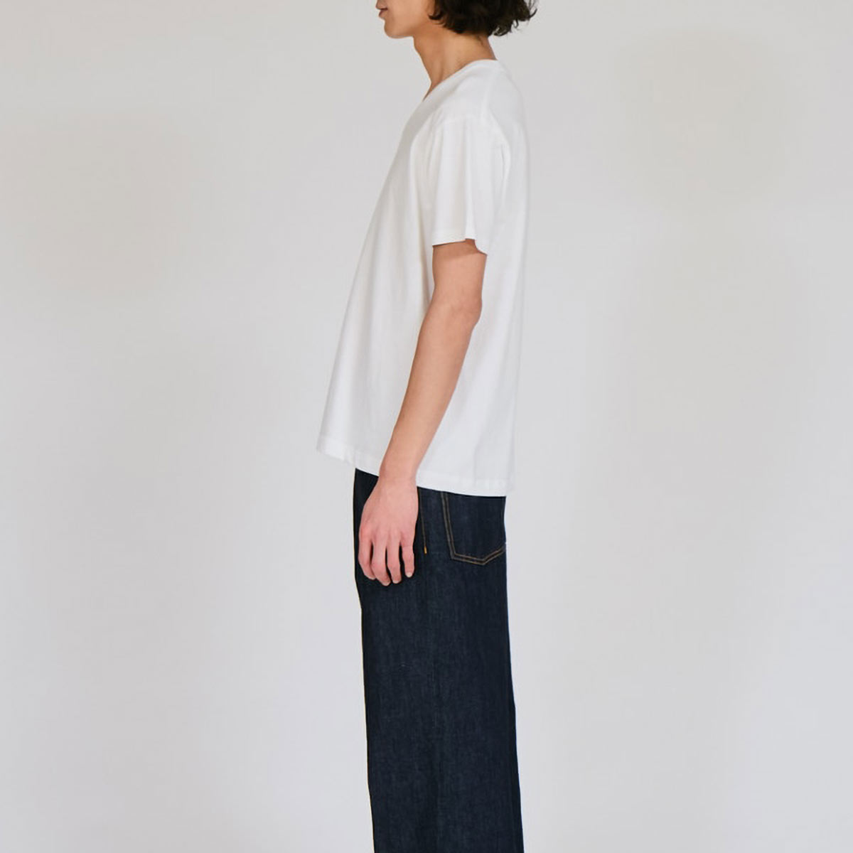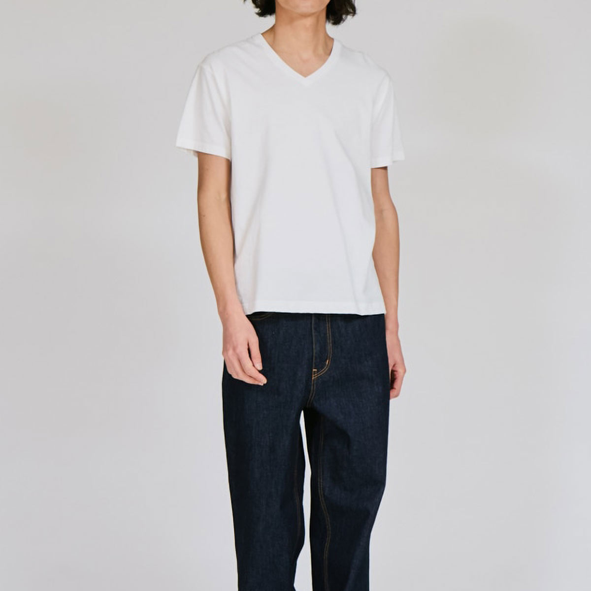 時代のニーズにマッチした厚さと素材感が特長の「透けにくい5.3オンス」を使用。脇に縫い目のない丸胴編みによるストレスフリーの着心地が特長で、着用の当初から着慣れた風合いが味わえるガーメントウォッシュ加工をしています。着丈を短く、アームホールをしぼり、ネックを細めに設定。さらに袖のパターンも変更するなど日本人の体形に合わせたシルエットで絶妙なフィット感を実現しました。インナーとしても一枚着としても着用でき、リブの強度が高く、首元の形状安定性に優れたアイテムです。Vネックは汎用性の高い開きで、着丈はタックインした時に日常の動き程度ではボトムスから出にくい設定です。