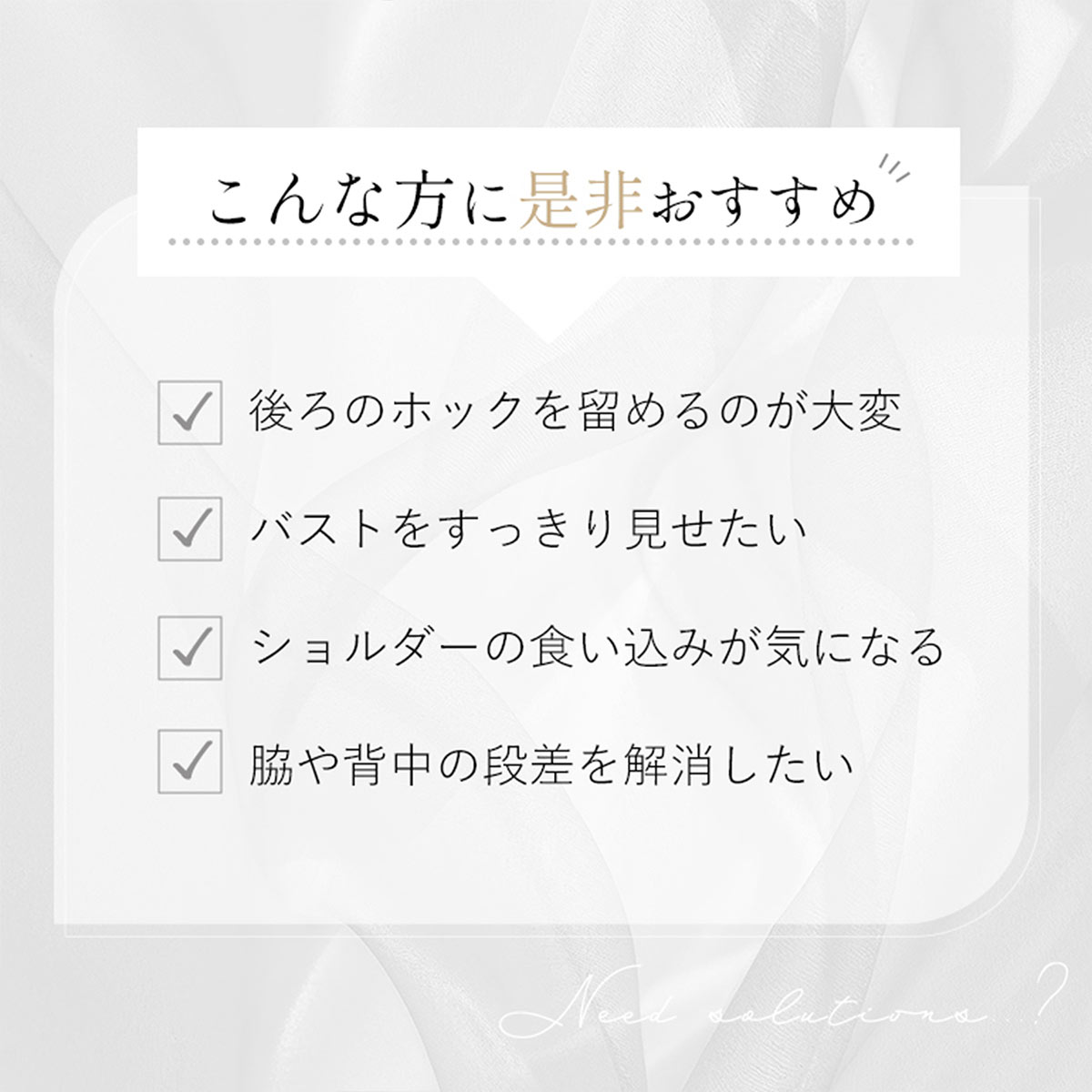 バスト部分は、特許取得のメッシュ構造とバスト底辺の持ち上げパネル・サイド押さえパネルで自然な丸みをキープ。さらに下からバストを引き上げるループ設計や三重構造のカップがバストをしっかり支え、肩の伸縮ショルダーがバストを正しい位置に整えつつ肩への負担も軽減します。