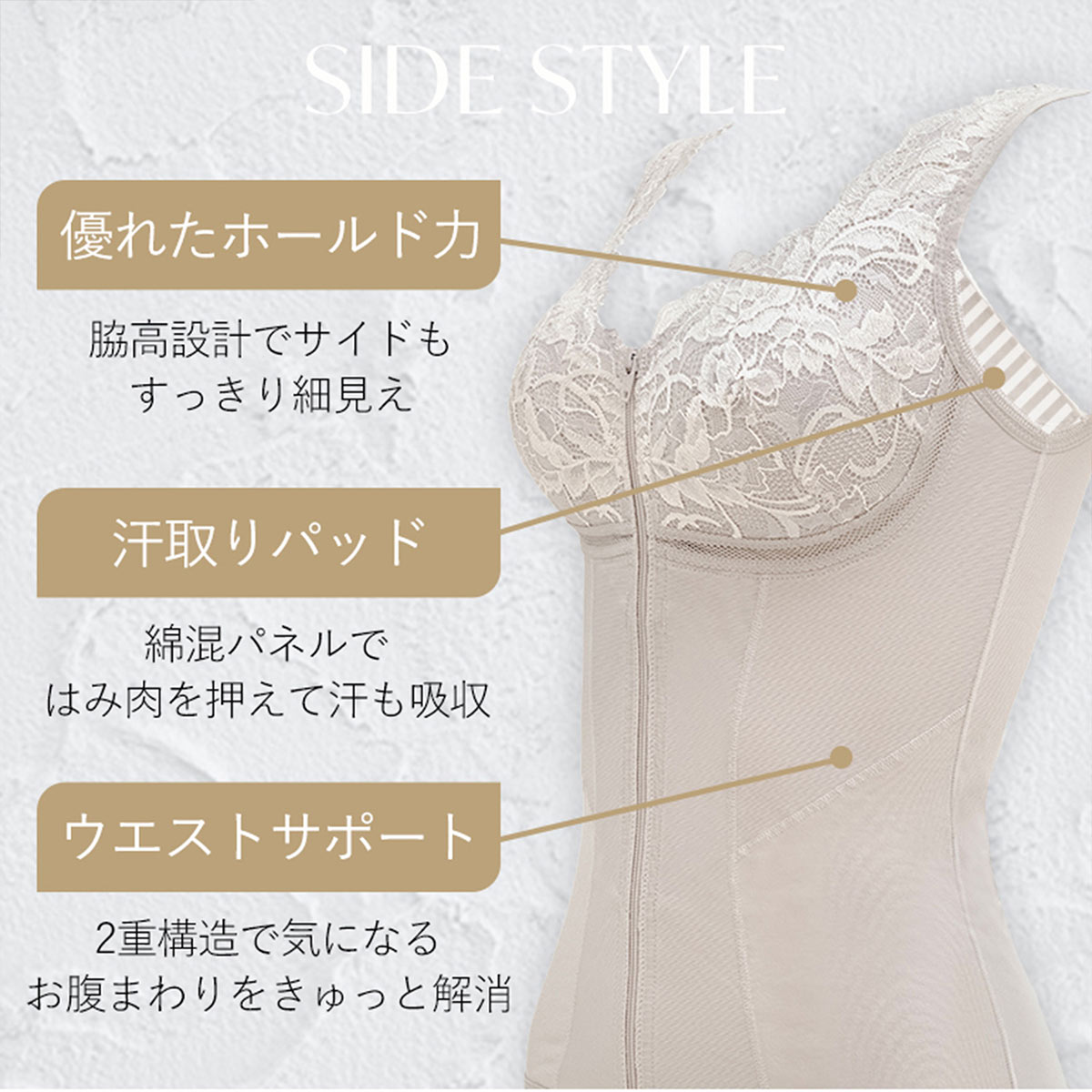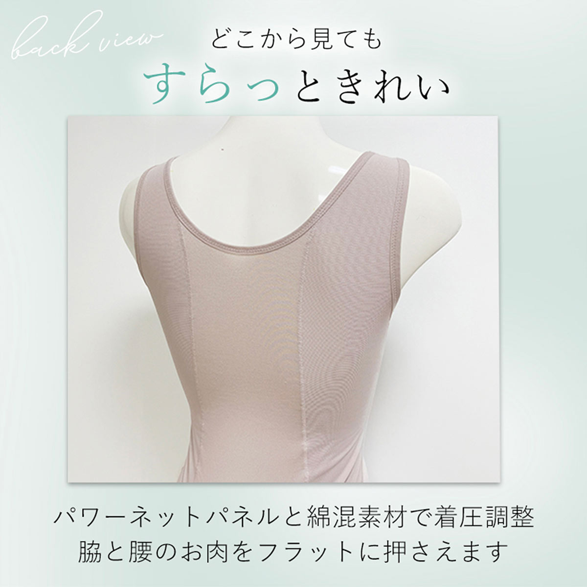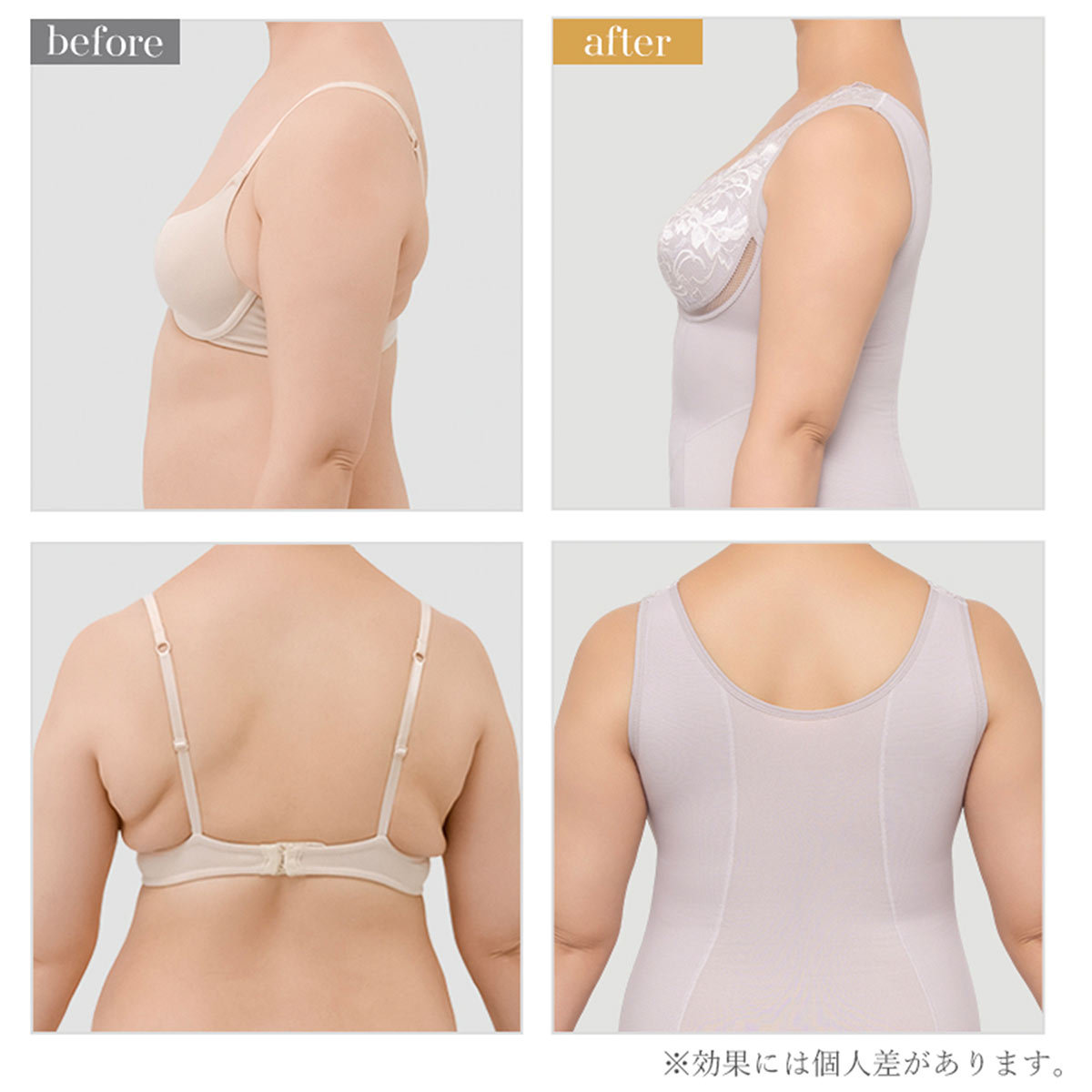 お腹や脇は身生地とパワーネットの二重仕様で広く押さえ、カップのずり上がりを防ぎつつ脇まわりもすっきり。背中は段差になりやすい脇や腰のお肉もフラットに整える着圧設計で後ろ姿まで美しくキープ。