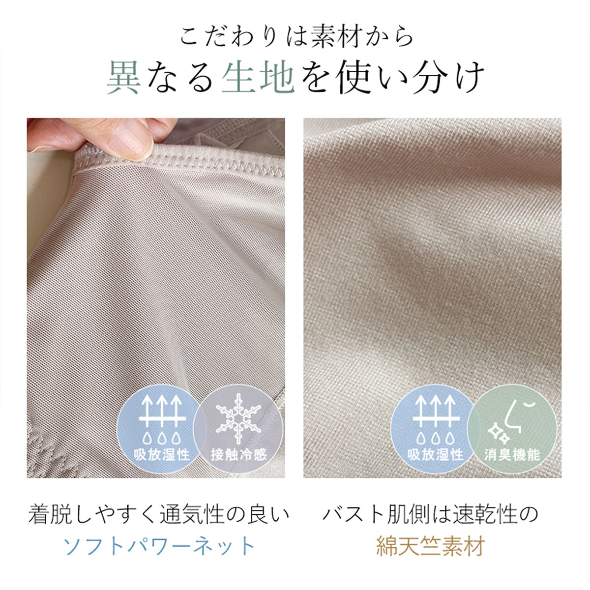 身生地は柔らかくなめらかな肌触りの最高級スーピマ綿を混紡したナイロン綿ベア天竺を使用。接触冷感・吸汗速乾機能付きで、汗をかいてもサラッと快適な着心地をキープします。パッドポケットやレース裏カップの綿混生地は汗のニオイもケア。