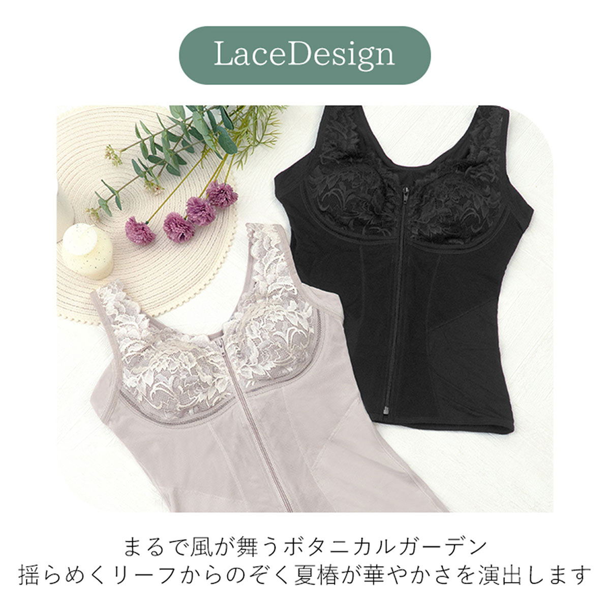 ラクに着脱できるフロントファスナータイプの補整ブラキャミ。金具が直接お肌にあたらないよう綿混タオル生地をはさんでいるので、谷間の汗もしっかり吸収して快適です。お好みの位置で開き具合を止められるので着用感の微調整が可能です。