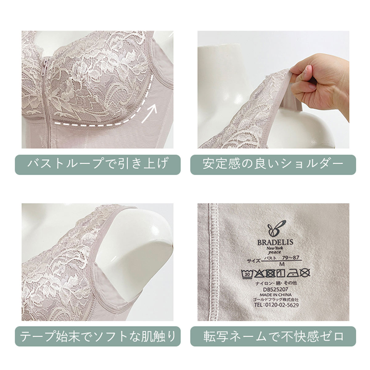 | 仕 様 | ・ノンワイヤー ・脇高設計 ・ホック:なし、フロントファスナー ・穴あき高通気パッド:取外し可能(サイズにより形状が異なります) ・肩紐取外し:不可 ・サイドボーン:あり ・接触冷感 ・通気性 ・吸水速乾 ・補整機能:ソフト ・胸元・脇に消臭機能付き ・洗濯ネームは身生地に転写