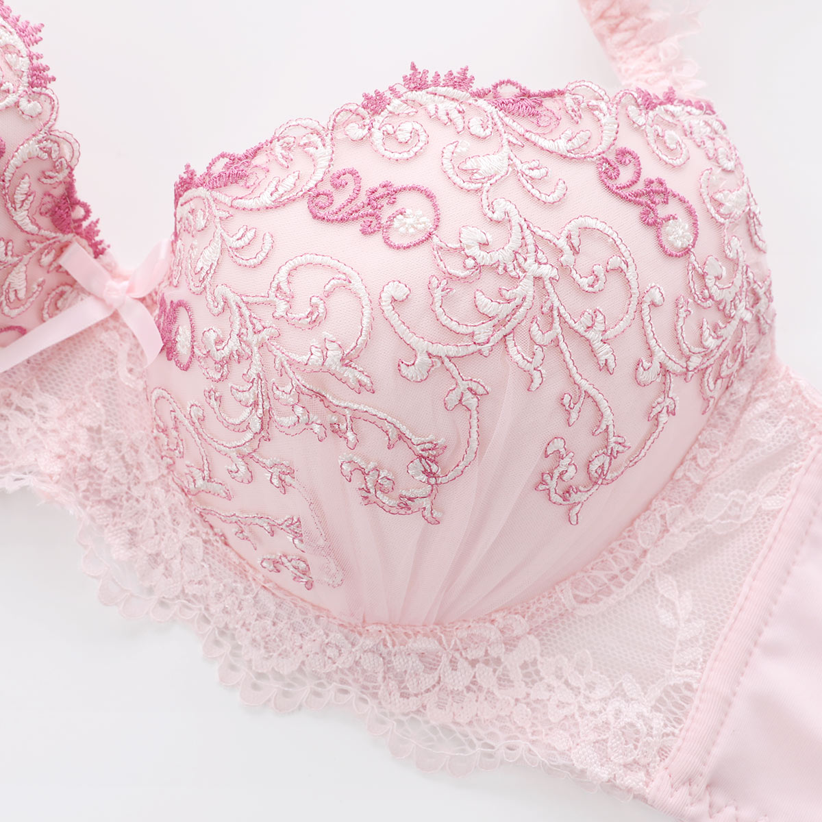幻想的なアラベスク柄の刺繍が洗練された美しさ。土台部分にもレースをあしらい、デコラティブな仕上がりです。