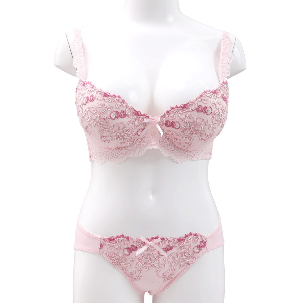 エレガント 脇肉を谷間に変える脇高ブラ アラベスク刺繍 ブラセット CDEF80-95 盛り胸 寄せ上げ ブラジャー ショーツ セット Elegante(PI-ピンク-C85-LL)