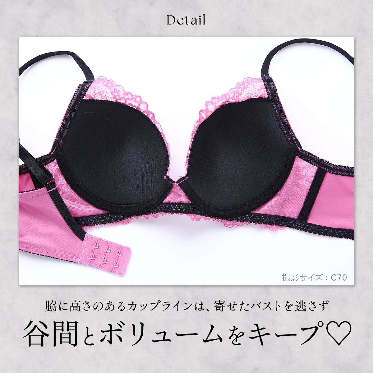 | 仕 様 | ブラ ・脇高設計 ・3/4カップ ・モールドカップ(取外し不可・パッドポケット無し) ・ワイヤー入 ・サイドボーン:あり ・肩紐取外し:不可 ・ホックの数:2段3列