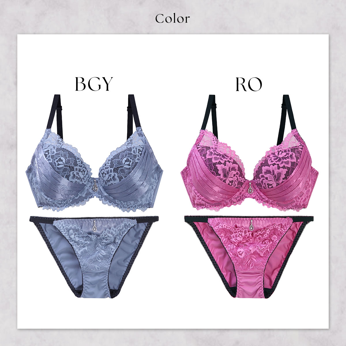 繊細なレースに光沢感のある艶やかなジャガードサテンを合わせた、洗練された色っぽさが漂うデザイン。ストラップやカップはブラックで引き締めて凛としたアクセントに・胸中心にはジュエルチャームが華やぎを添えます。