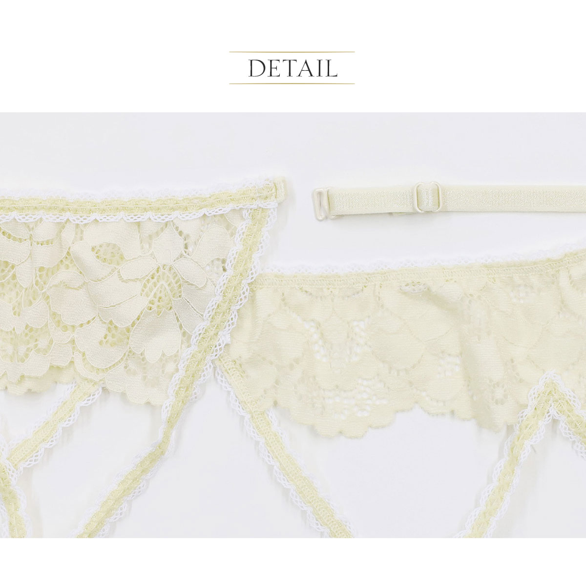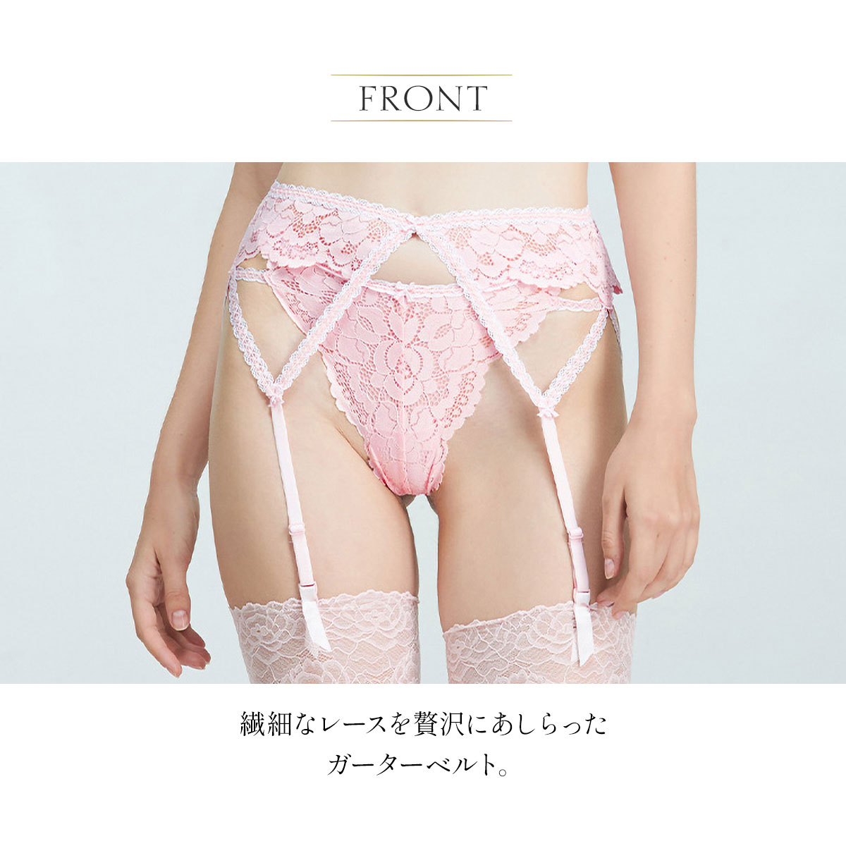 繊細なレースを贅沢にあしらったガーターベルト。エレガントさとセンシュアルな魅力を引き立てます。さりげないリボンディテールが、愛らしさをプラス。