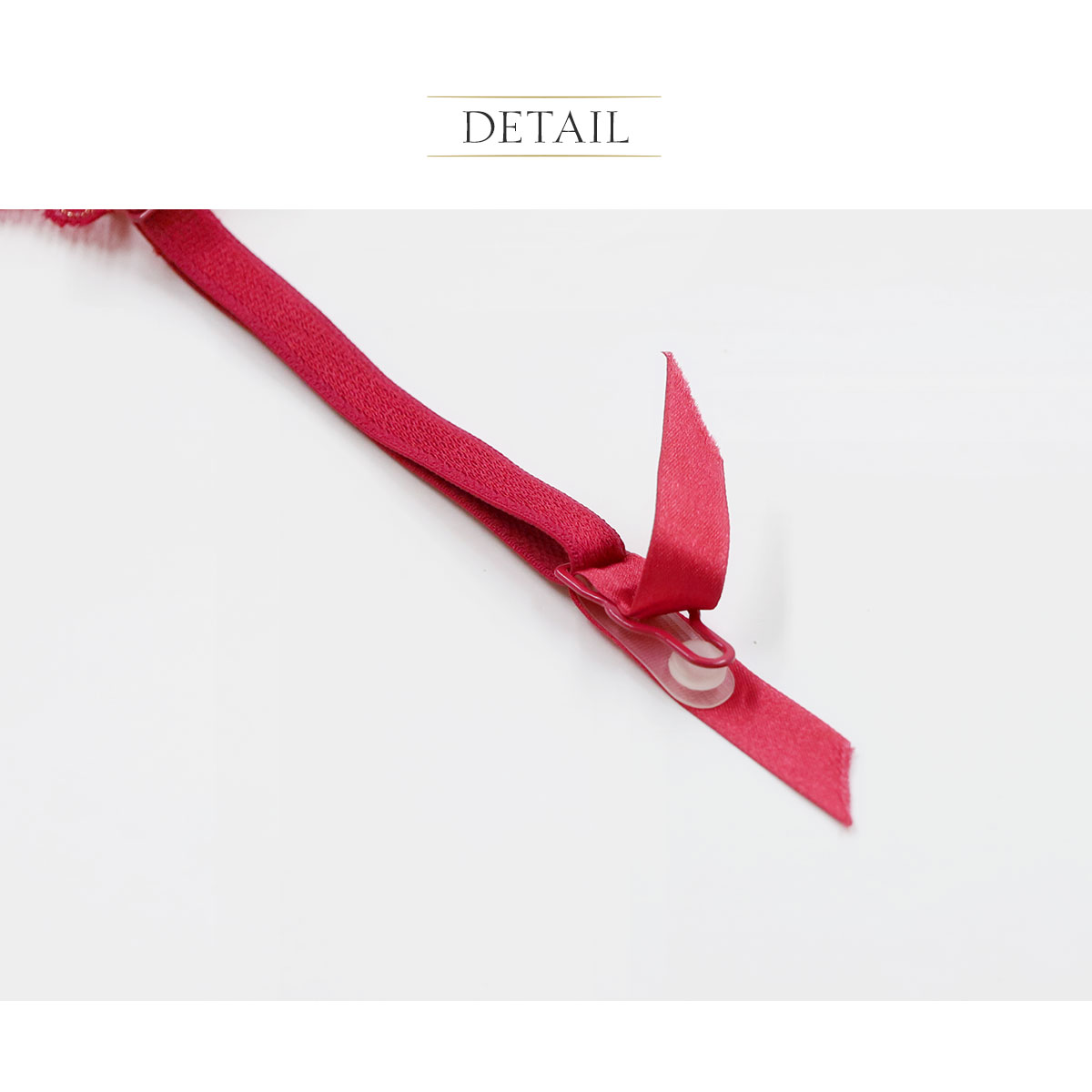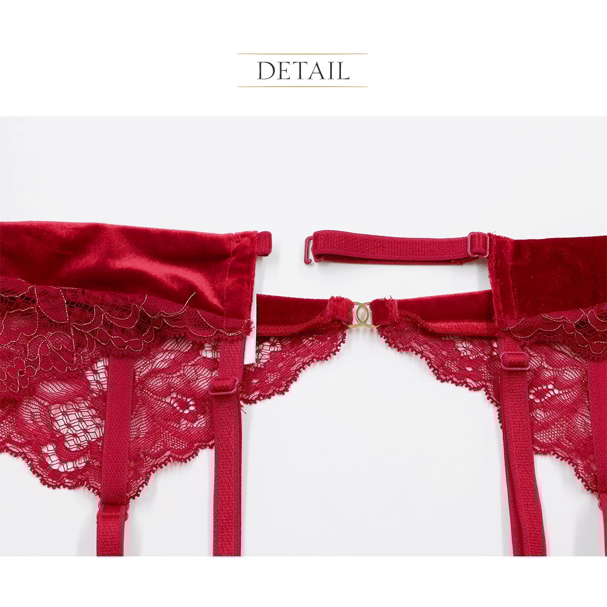 高級感漂うベロア生地と繊細なレースを贅沢に組み合わせた、ラグジュアリーなガーターベルト。滑らかで美しい光沢のベロアが艶感を添え、華やかさを演出します。レースの透け感がフェミニンで繊細なアクセントに。