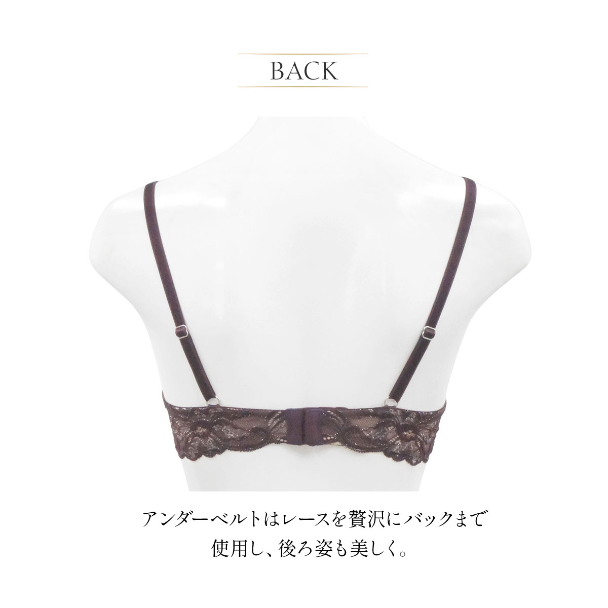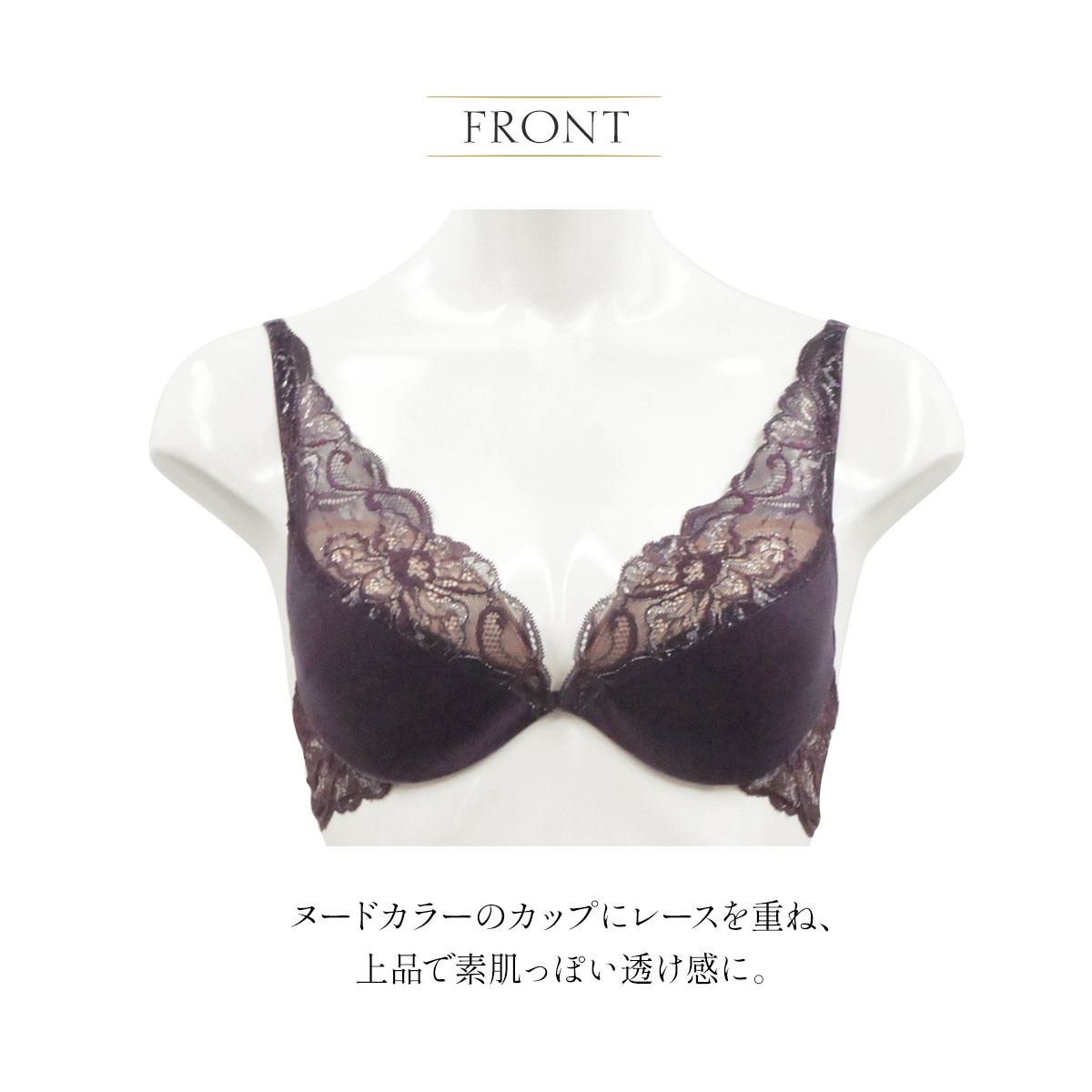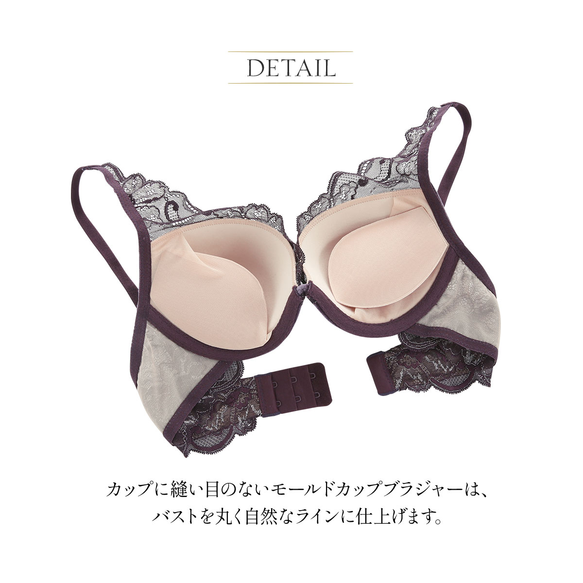 カップに縫い目のないモールドカップブラジャーは、バストを丸く自然なラインに仕上げてくれます。着け心地がラクでANNEBRAファンに大人気のタイプです。ヌードカラーのカップにレースを重ね、上品で素肌っぽい透け感に。アンダーベルトはレースを贅沢にバックまで使用し、後ろ姿も美しく。