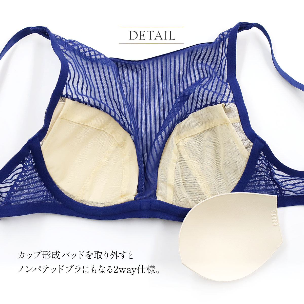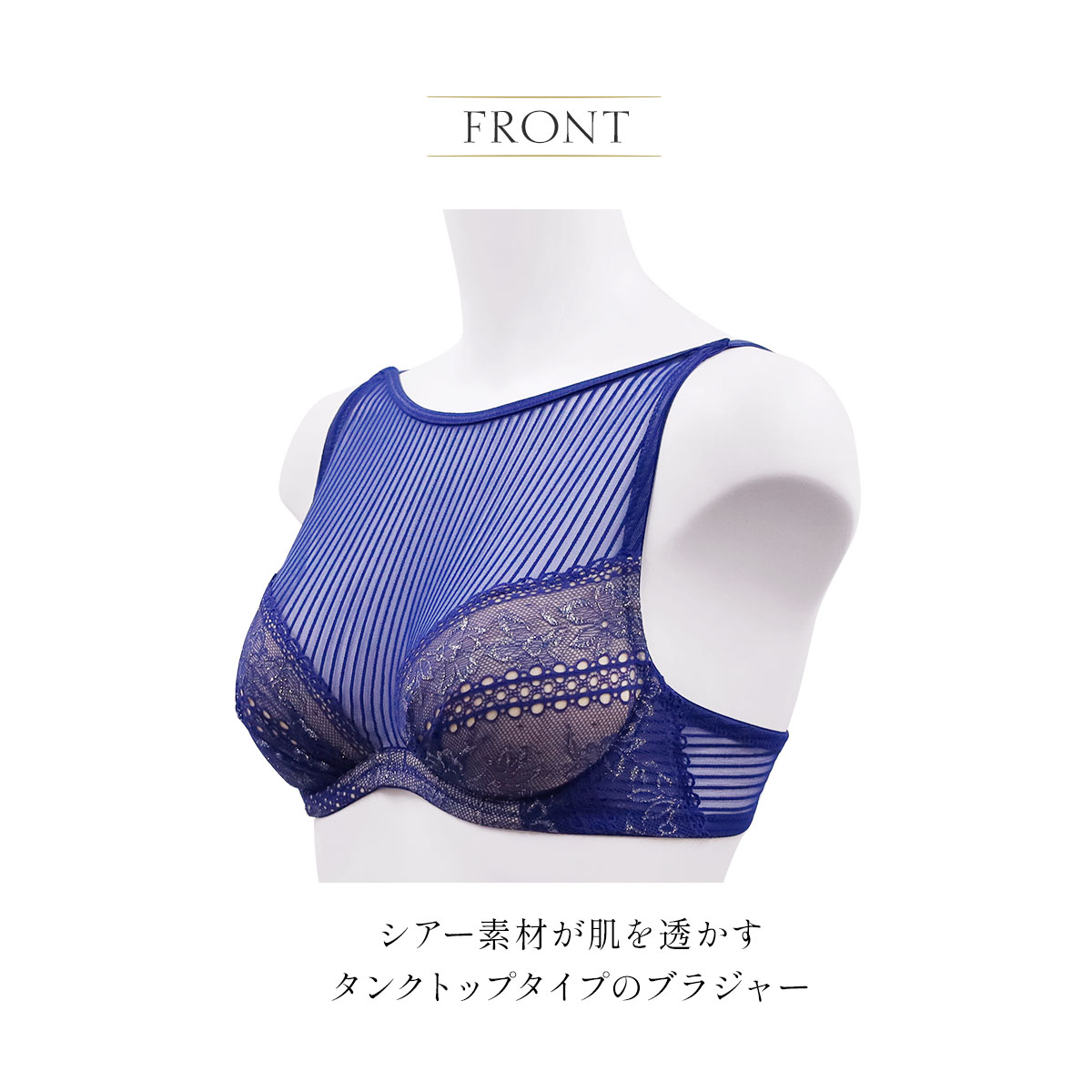シアー素材が肌を透かすタンクトップタイプのブラジャー。カップ形成パッドを取り外すとノンパテッドブラにもなる2way仕様。レースの下にベージュのチュール生地を裏打ちしているので、カップ形成パッドを取り外しても程よい透け感でご着用いただけます。厚いパッドが苦手な方、ボリュームを抑えたい方にもおすすめです。インナーとして使うのはもちろん、ジャケットに合わせたり。ランジェリーファッションに取り入れるのもおすすめのアイテムです。