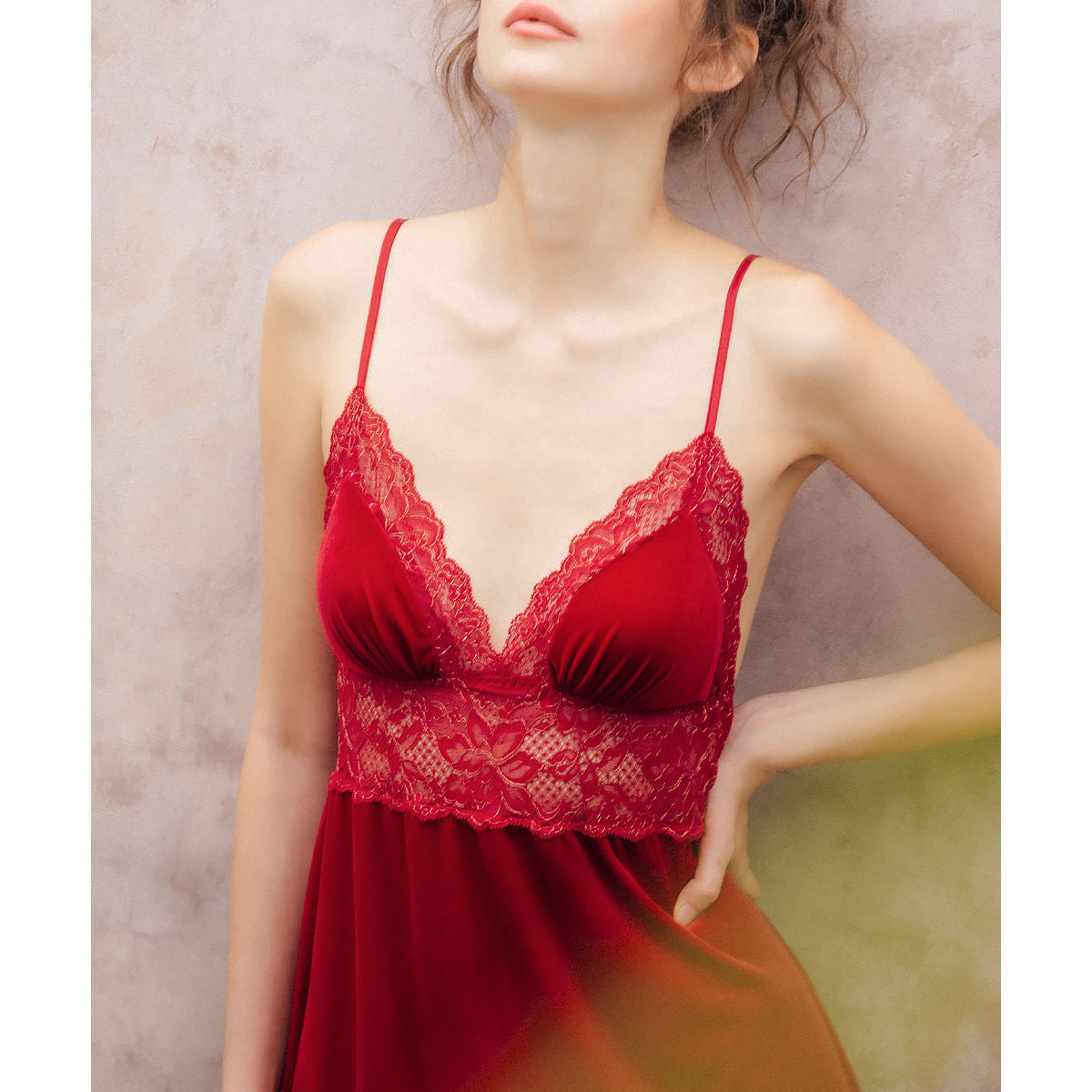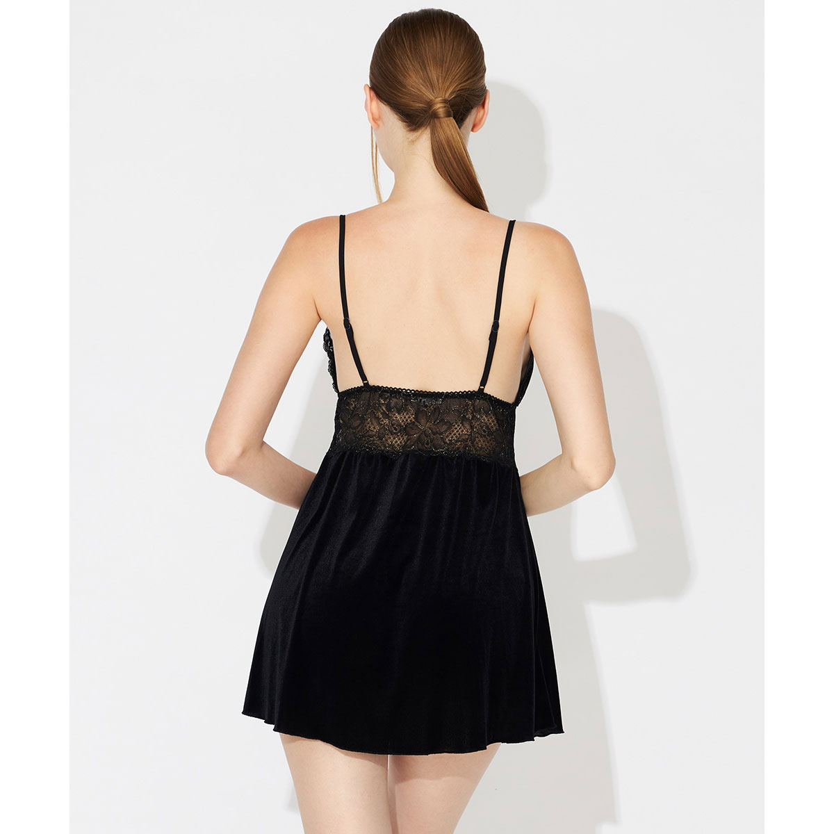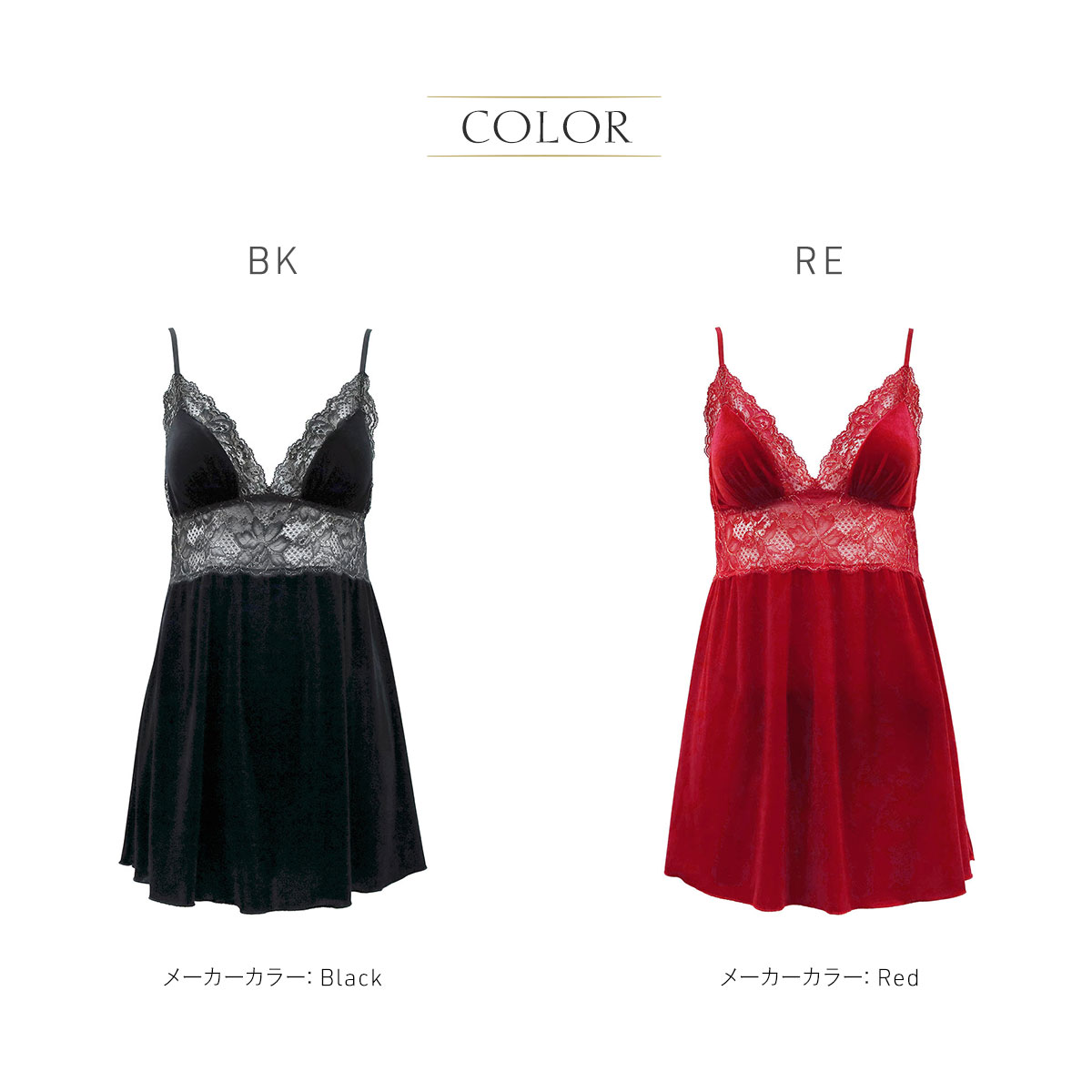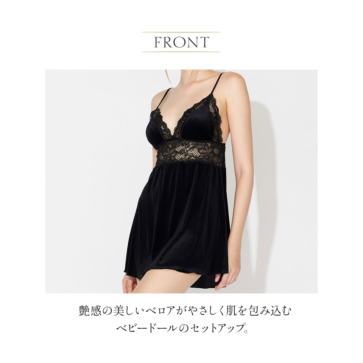 夜を彩るベロアとレースの優美なベビードール上下セット