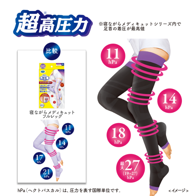 | 仕 様 | ・フルレッグタイプ ・着圧:足首最大27(19-27)hPa ふくらはぎ18hPa 太もも14hPa 付け根11hPa ・つま先なし(トウレス) ・日本製