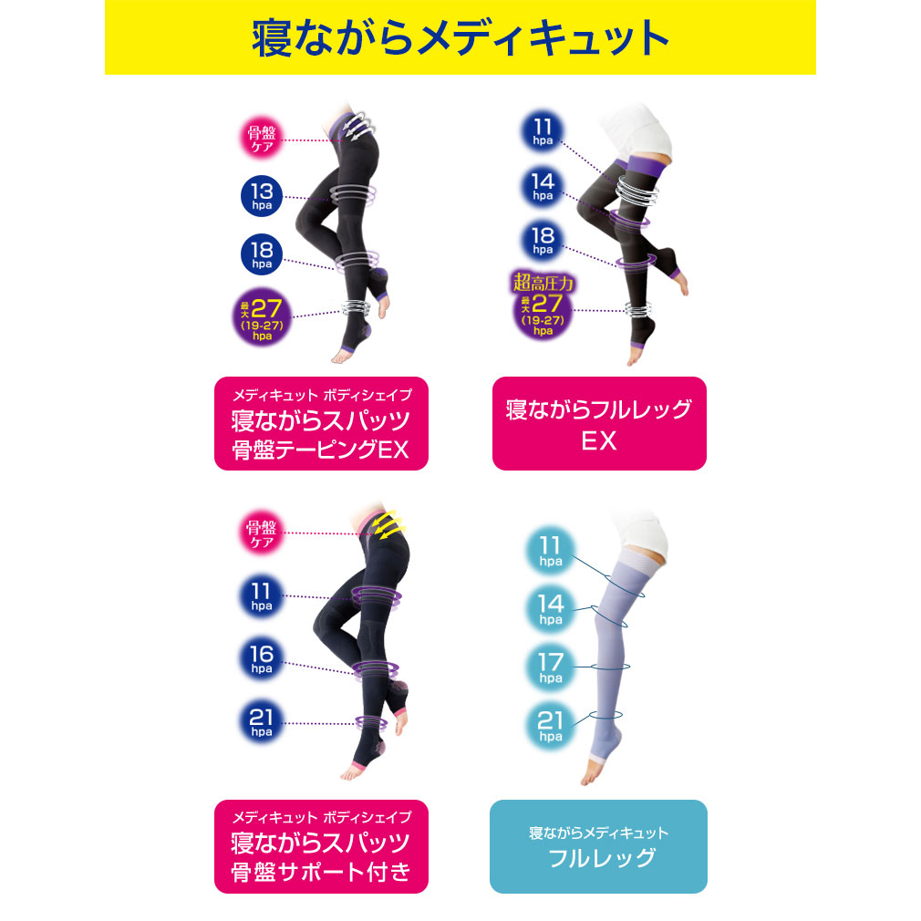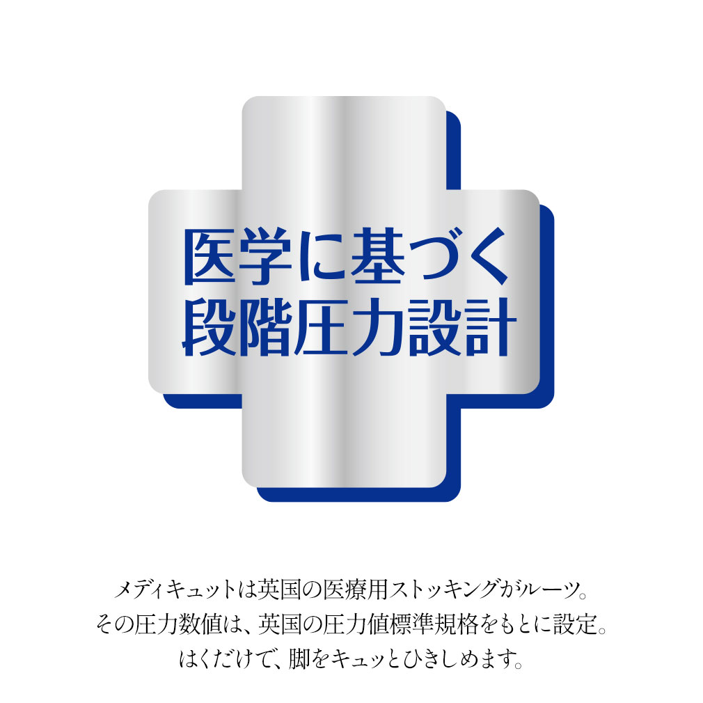 メディキュットはコンプレッションセラピーの考えを元に英国で開発された医療用ストッキングがルーツ。その圧力数値は英国の圧力値標準規格をもとに設定し、デイリーシーンに応じた最適な圧力値を採用しています。
