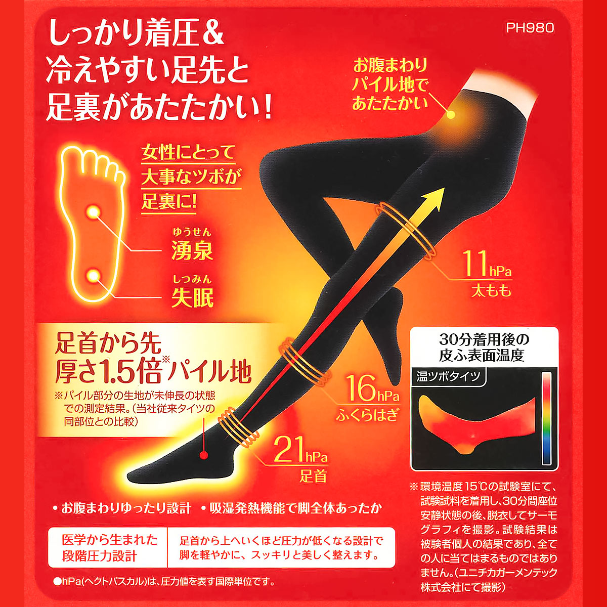 | 仕 様 | ・段階着圧:足首21hPa ふくらはぎ16hPa 太もも11hPa ・吸湿発熱機能 ・お腹まわりゆったり設計