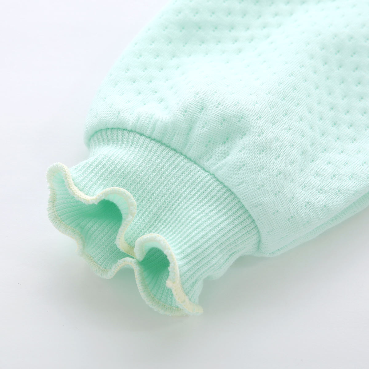 身生地はふかふかの温かさ。袖・衿くちのフリルが可愛いデザインです。ウエストはゴム仕様で替え口がついており、前後がわかるラベルつきです。