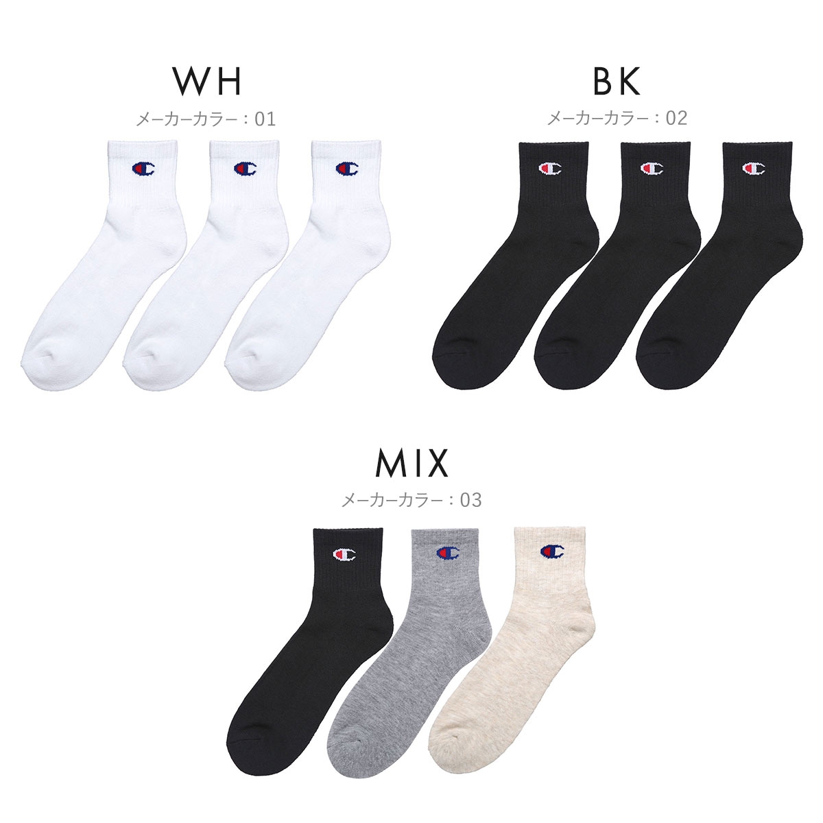 チャンピオン Champion クォーターレングス ハーフパイル ソックス 3足セット メンズ 靴下 カジュアル 定番(MIX-ミックス-24-26cm)