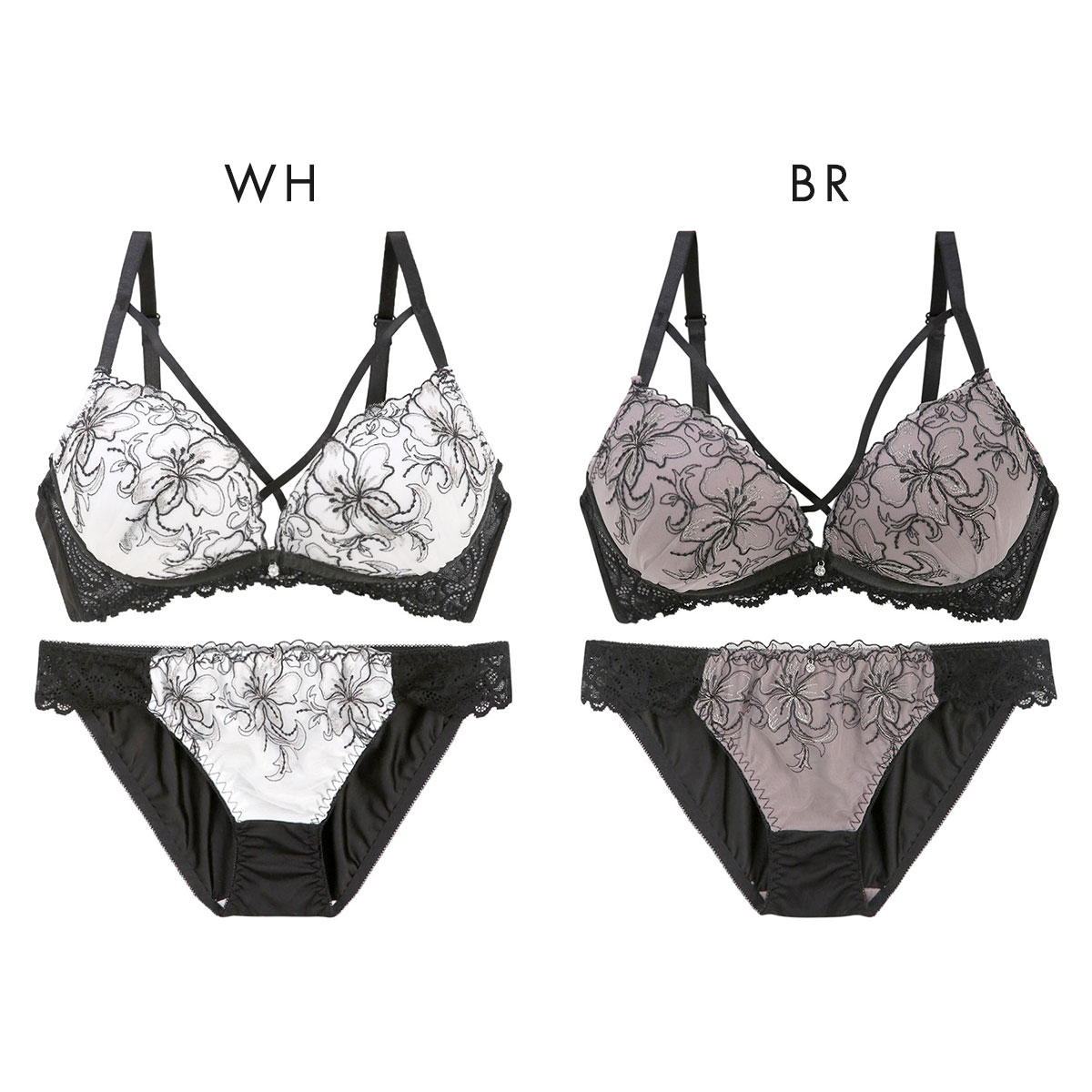 ノンワイヤーの快適さと谷間メイクを両立したブラ&ショーツセット。繊細なラメ糸がきらりと輝く上品な刺繍レースと、谷間に架かるセクシーな配色クロステープが引き立てあうオトナかわいいデザインです。