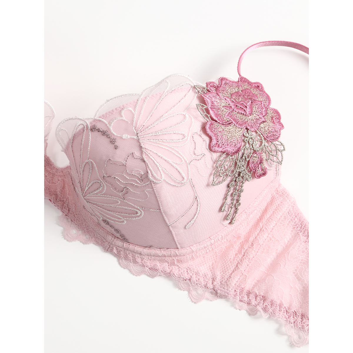 1匹の蝶が羽を広げたようにデザインしたオリジナルのエンブロイダリーレースを使用したデザイン。両脇に添えた薔薇モチーフは、角度を変える度に高貴な輝きを放ちます。バックは柔らかく身体にフィットするストレッチレースを使用。