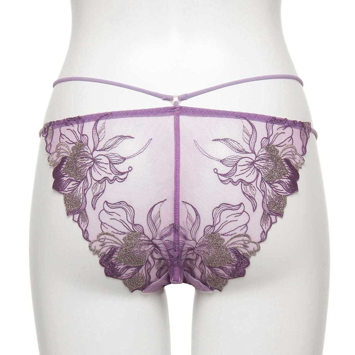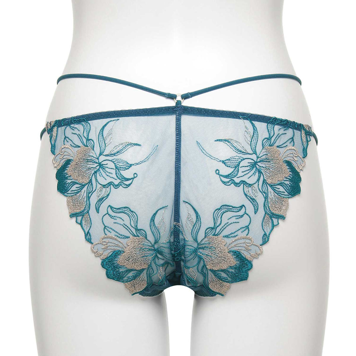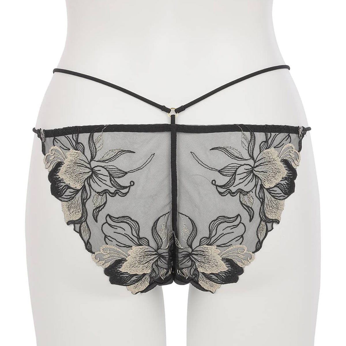 華やかに咲き誇る、大輪のエンブロイダリーレースがロマンティックな印象のノーマルショーツ。中央に大胆にあしらった花の刺繍が、視線を引き寄せる印象的なデザインです。どこかアンニュイな空気感を漂わせながら、優雅に揺れる花々が感情をそっと刺激します。