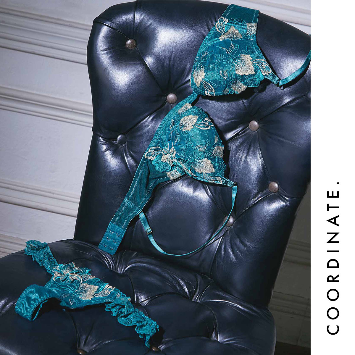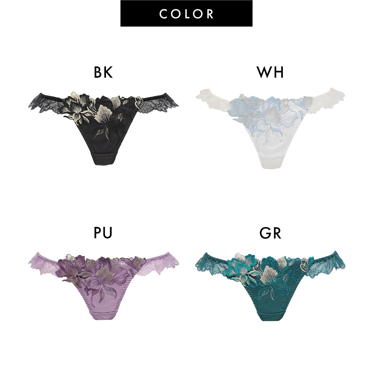 華やかに咲き誇る、大輪のエンブロイダリーレースがロマンティックな印象のTバックショーツ。中央に大胆にあしらった花の刺繍が、視線を引き寄せる印象的なデザインです。どこかアンニュイな空気感を漂わせながら、優雅に揺れる花々が感情をそっと刺激します。