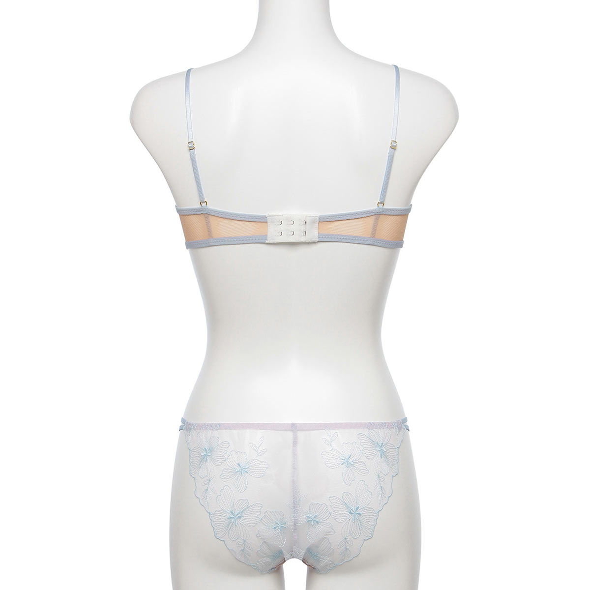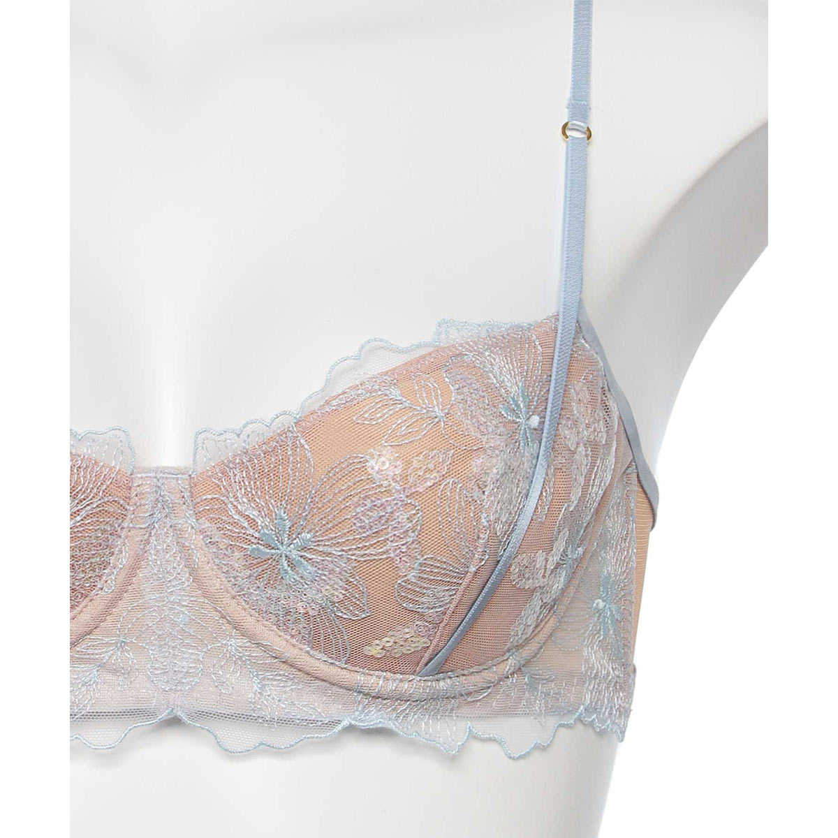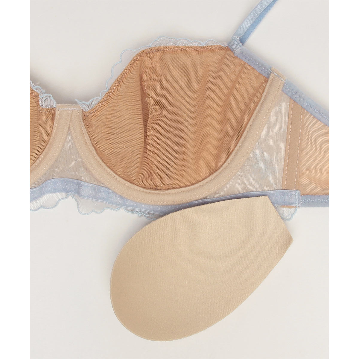 ブラストラップは、カップを優雅に横切るダブルコードデザインを採用。しっかりとバストをホールドしながらも、インポートライクな佇まいを演出。ブラ前面はレースとヌードカラーのパワーネットを重ねた透明感ある仕様で、パッドを外してセクシーランジェリーとしてもご着用いただけます。