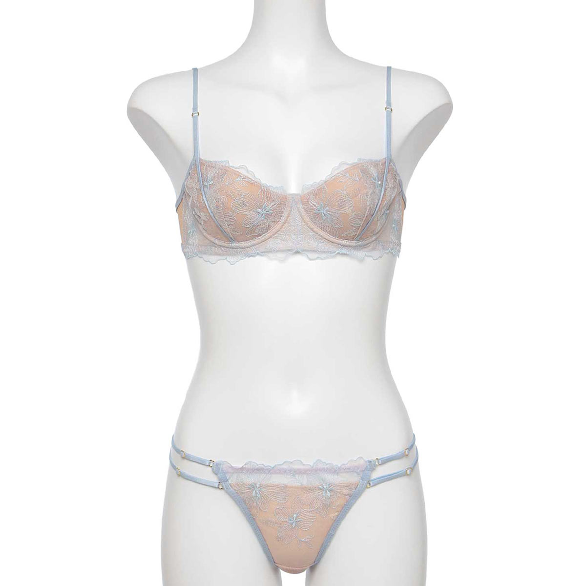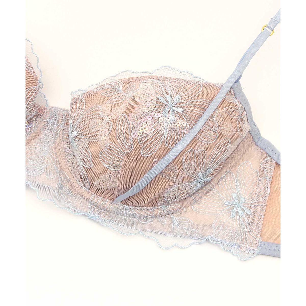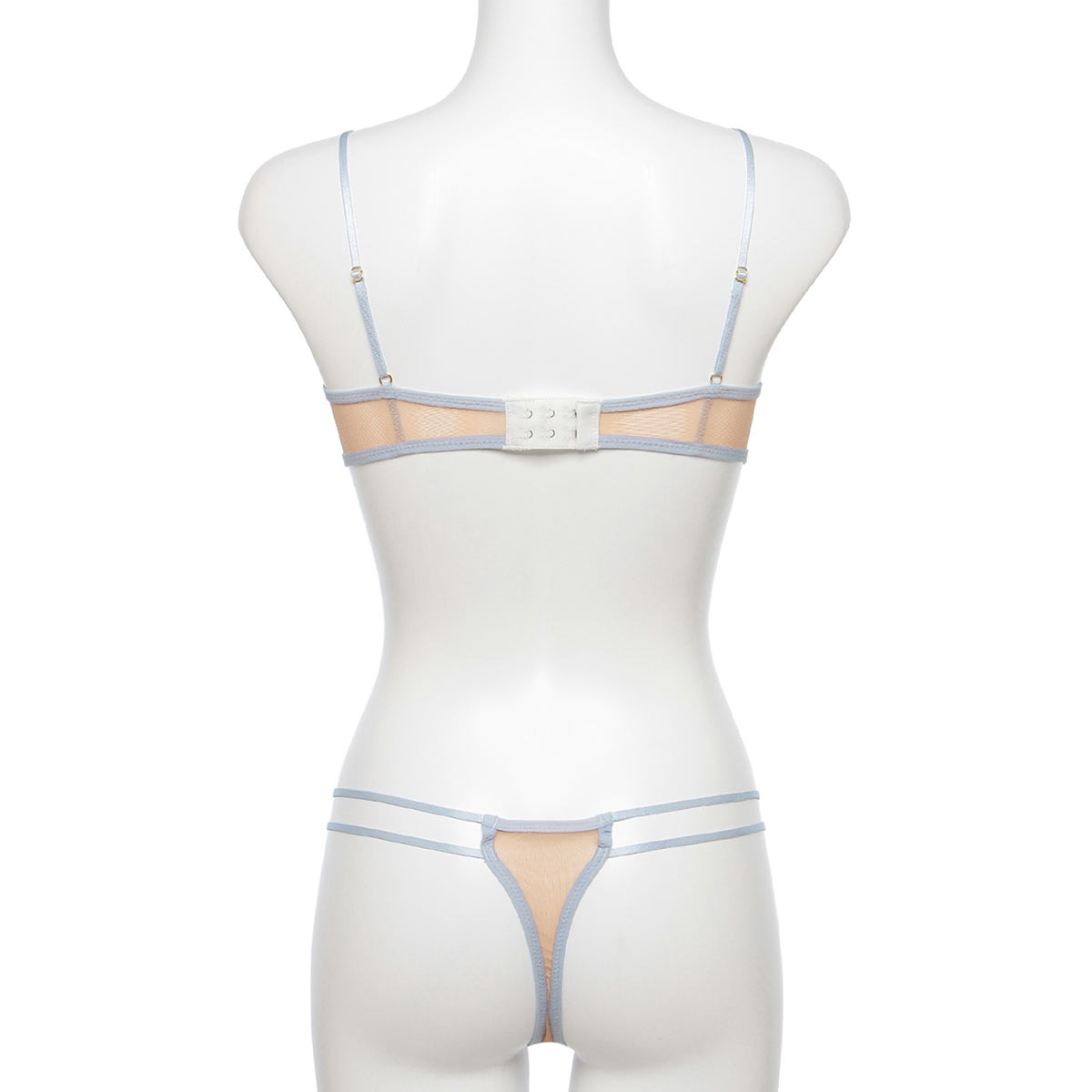 ブラストラップは、カップを優雅に横切るダブルコードデザインを採用。しっかりとバストをホールドしながらも、インポートライクな佇まいを演出。ブラ前面はレースとヌードカラーのパワーネットを重ねた透明感ある仕様で、パッドを外してセクシーランジェリーとしてもご着用いただけます。