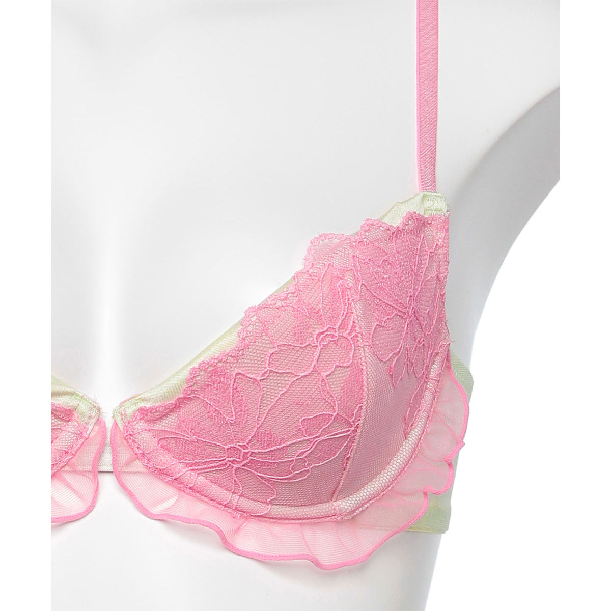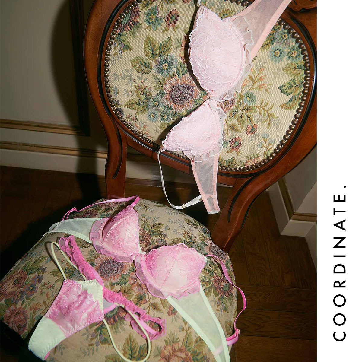 ブラはソフトな着け心地を叶える薄手のパッドを内蔵、優しくバストを包み込みます。サテンとラメ入りレースの組み合わせがデコルテを華やかに飾り、フリルが加わることで、ロマンティックな印象を際立たせます。