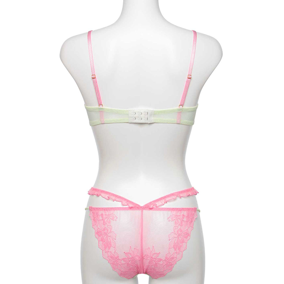 艶やかなサテン生地に、ほんのりとラメが煌めくストレッチレースを重ねた、贅沢なレイヤードデザイン。ギャザーをたっぷりと寄せたフリルが、ラブリーで甘美なムードを演出します。マカロンをイメージしたMINAMOさんこだわりの配色は、ホットピンク×レモンミントとベビーピンク×オフホワイトの2色展開で、見た目にも華やか。