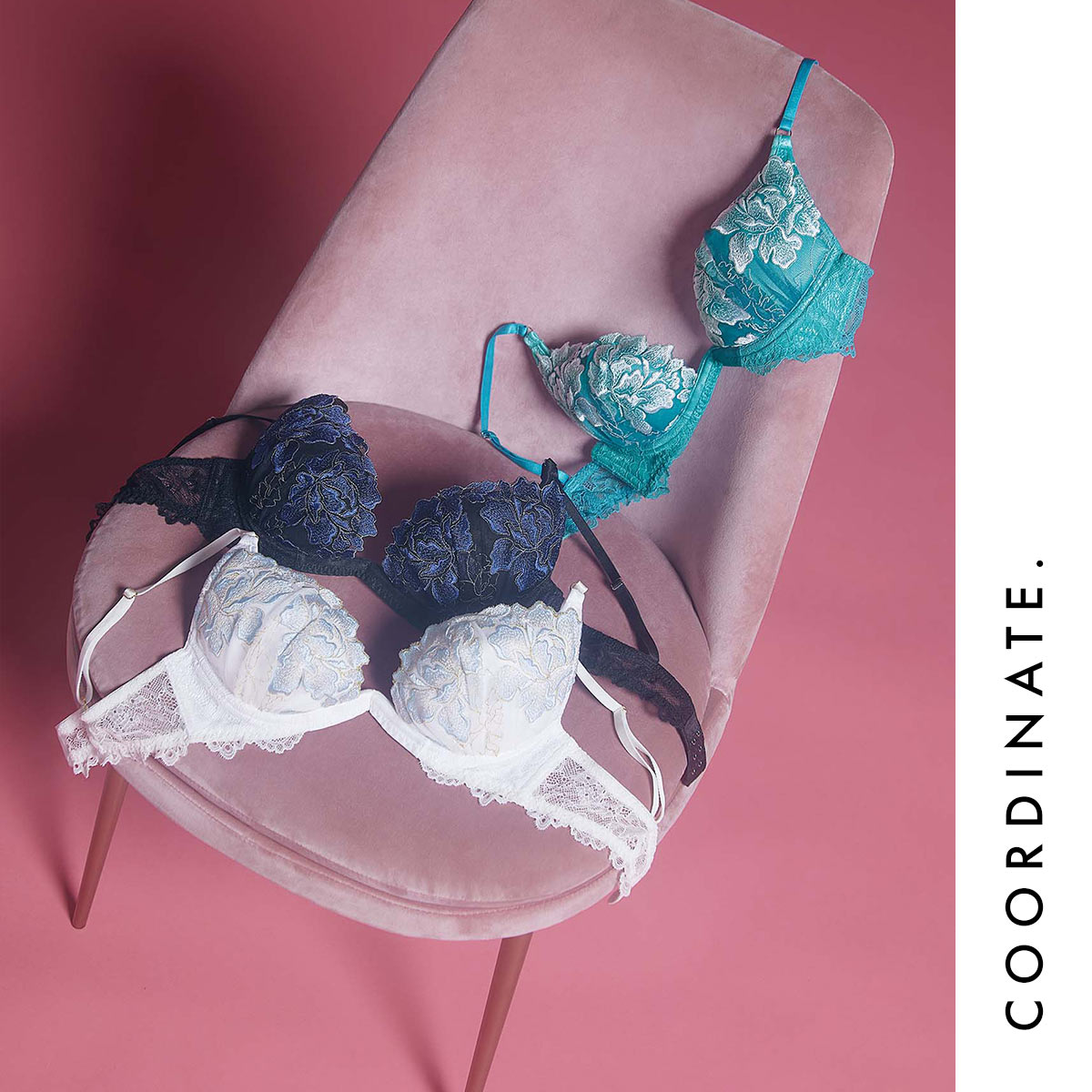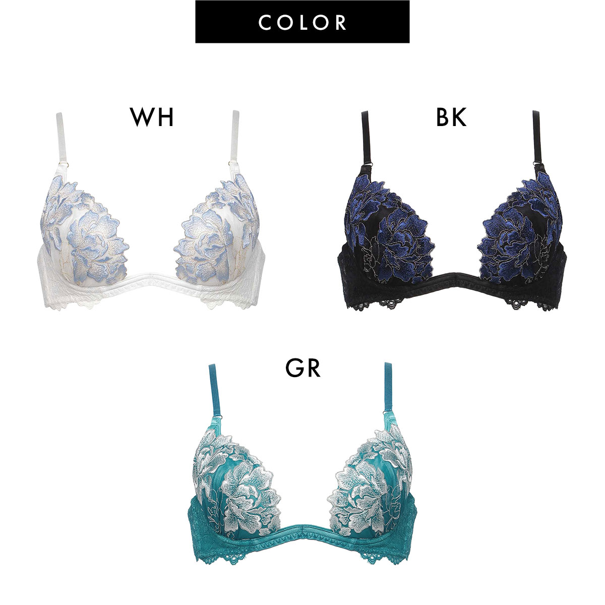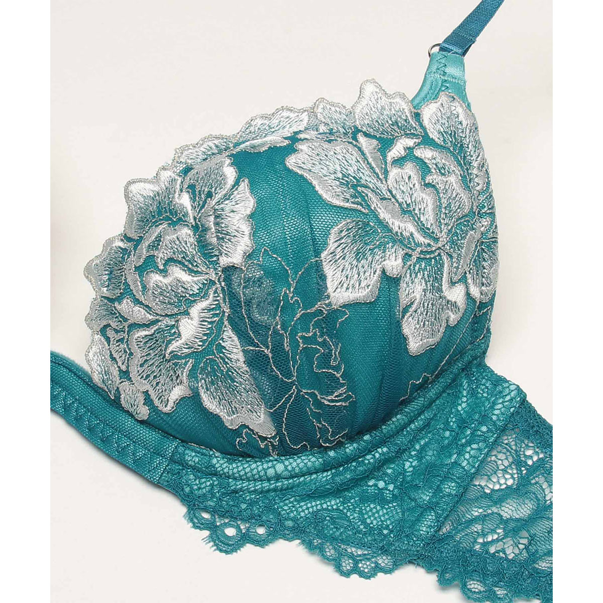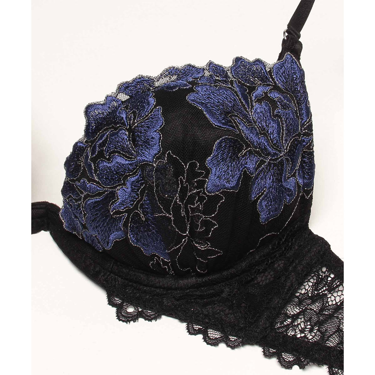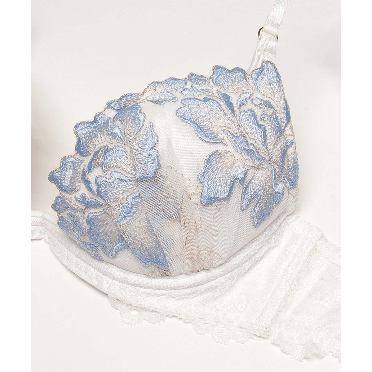 刺繍糸を贅沢に重ね、ラメがきらめく大輪のピオニー。カップ全体に咲き誇る花々が、胸元をゴージャスに彩ります。ブルーの刺繍が月明かりのようにやさしく輝きを添え、