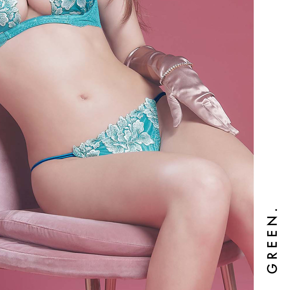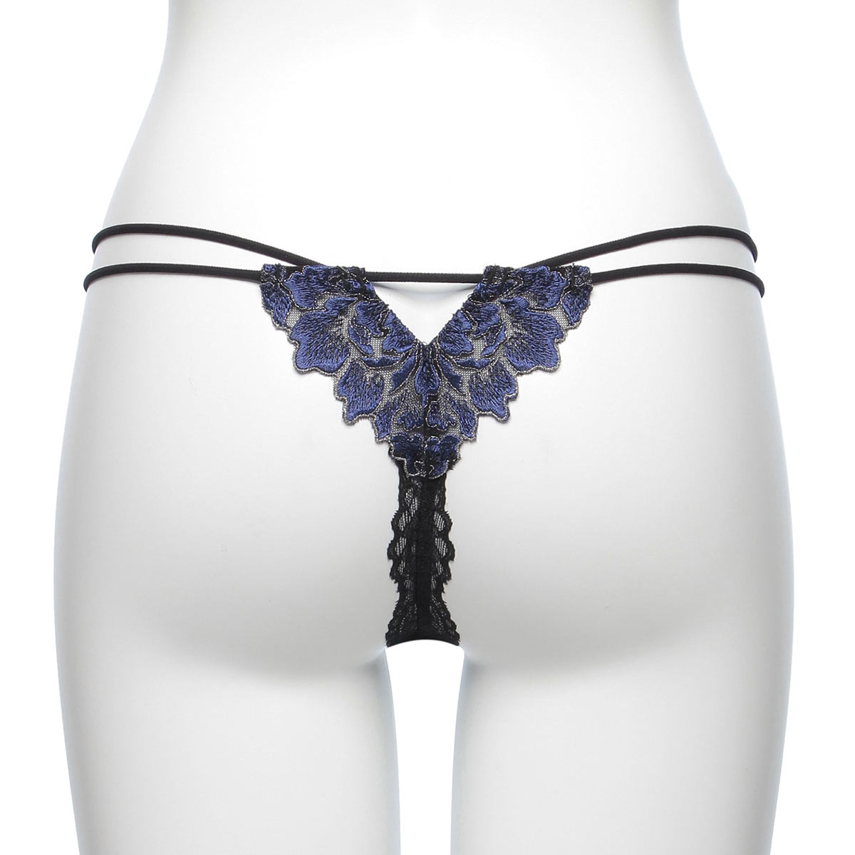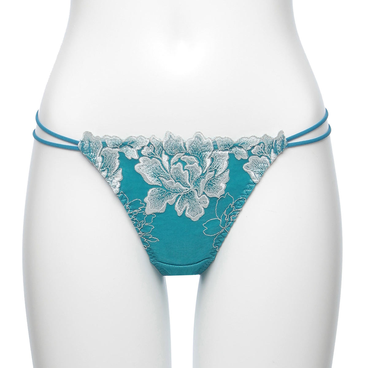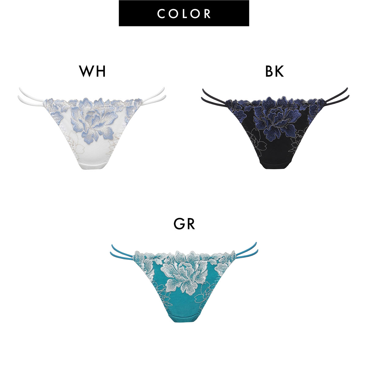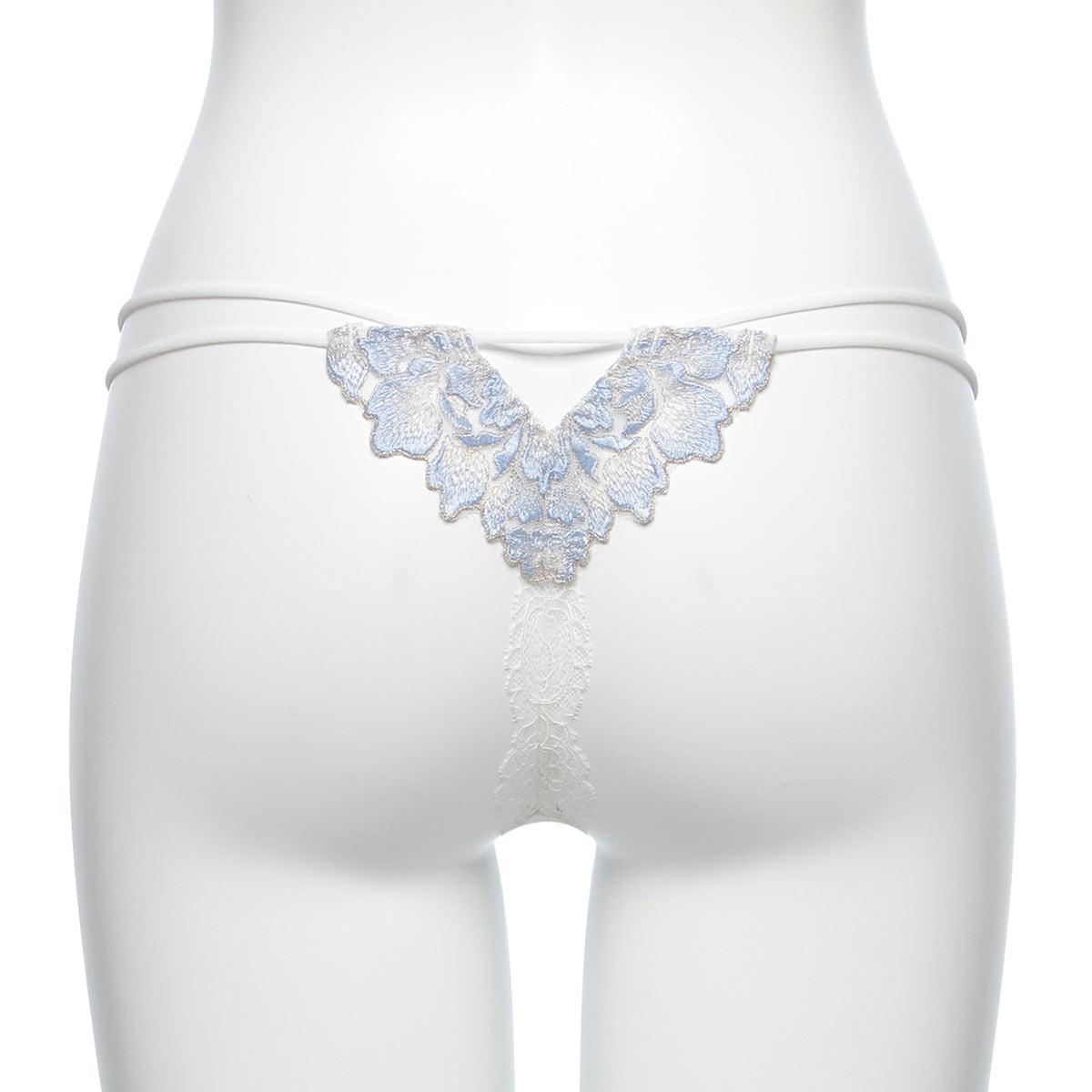 バックスタイルは華やかなエンブロイダリーレースから素肌がほんのりと透け、艶やかな色気を感じさせるTバックショーツ。全面を彩る花びらの立体感と、繊細にきらめくラメが圧倒的な存在感を演出します。サイドのダブルストリングコードが印象的なデザインです。
