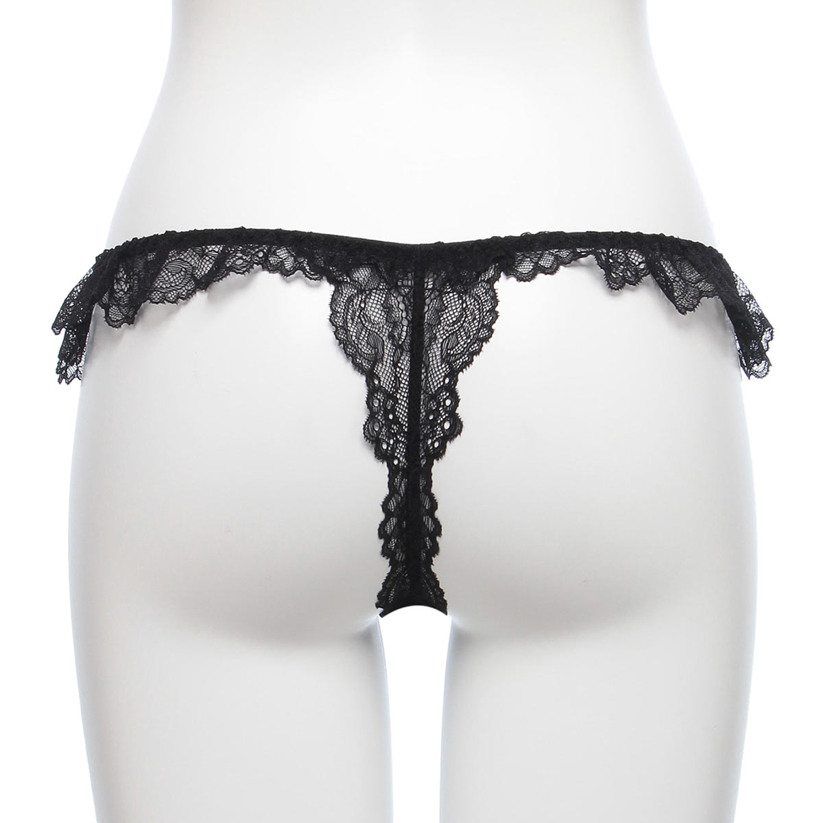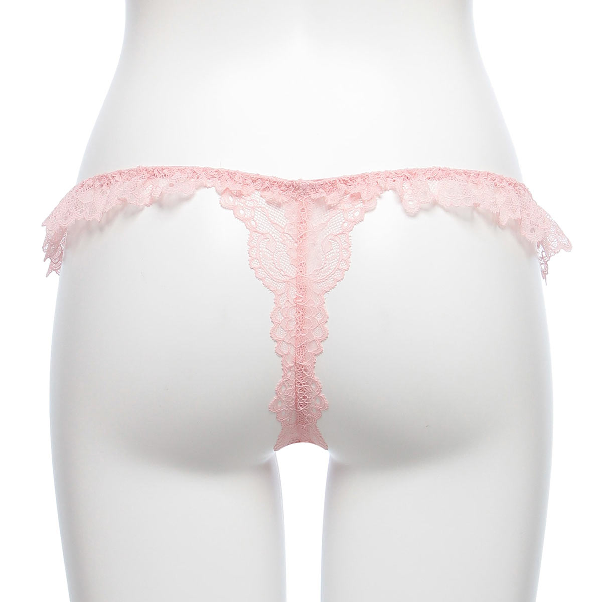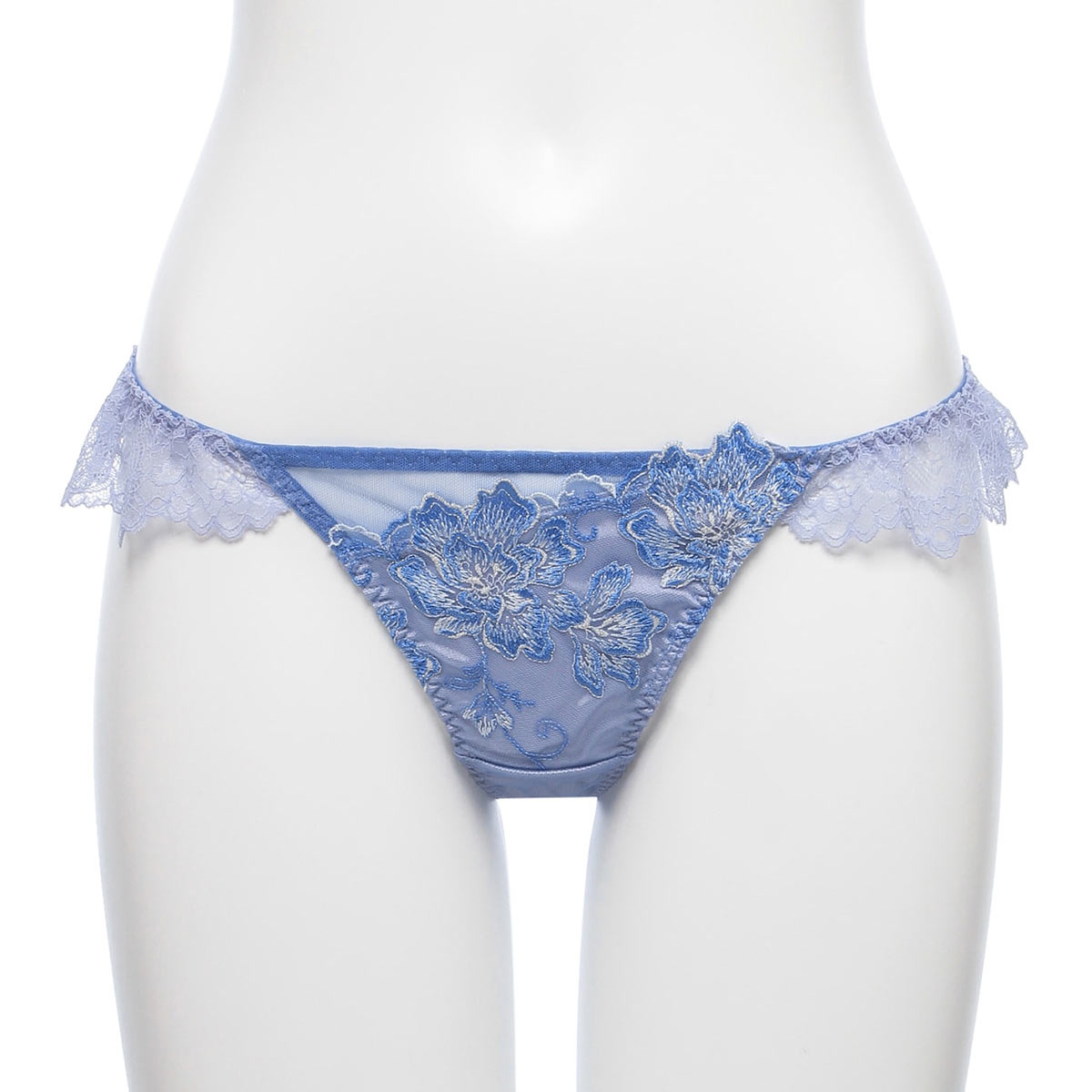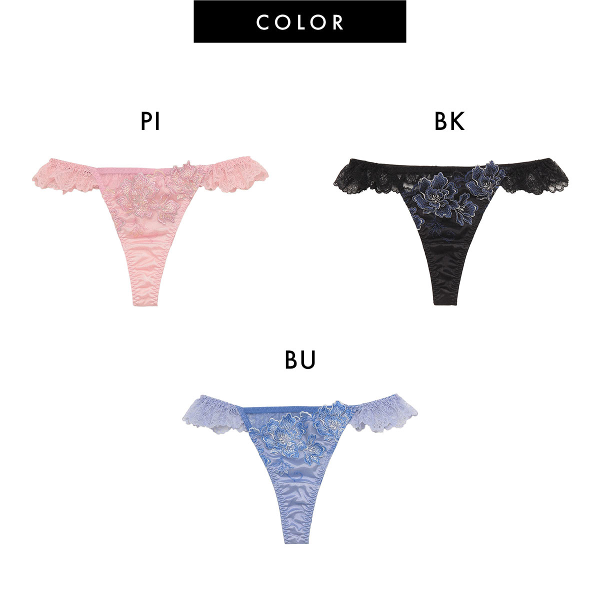 チュールから肌が透けるアシンメトリーデザインのTバックショーツ。サイドのフリルはふわりと広がり、腰回りを可憐に彩りますバックは柔らかなストレッチレースで心地良くヒップにフィット。