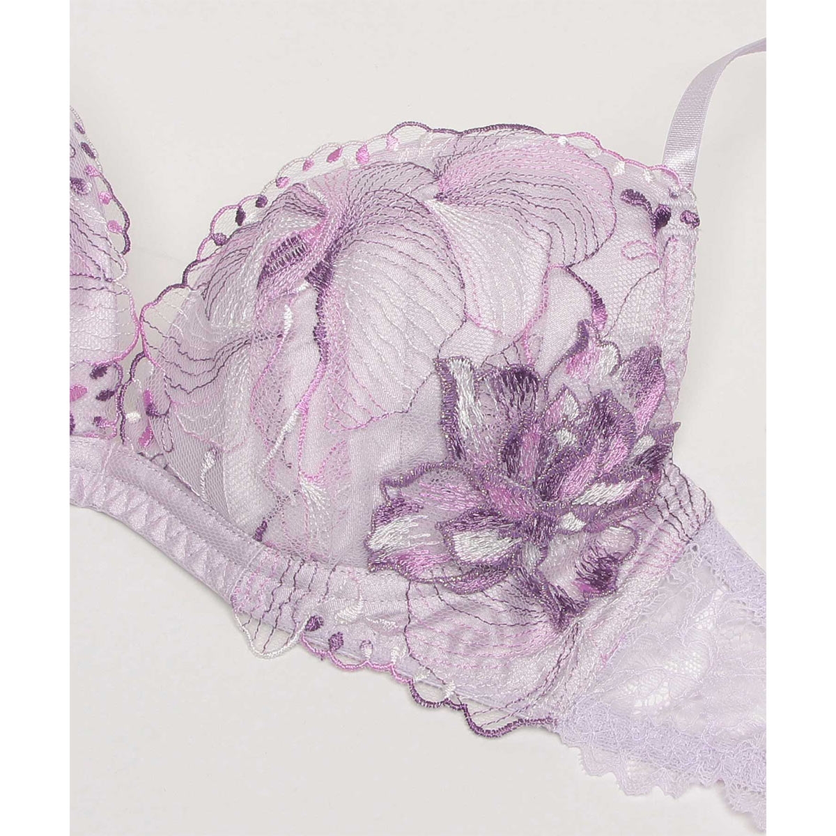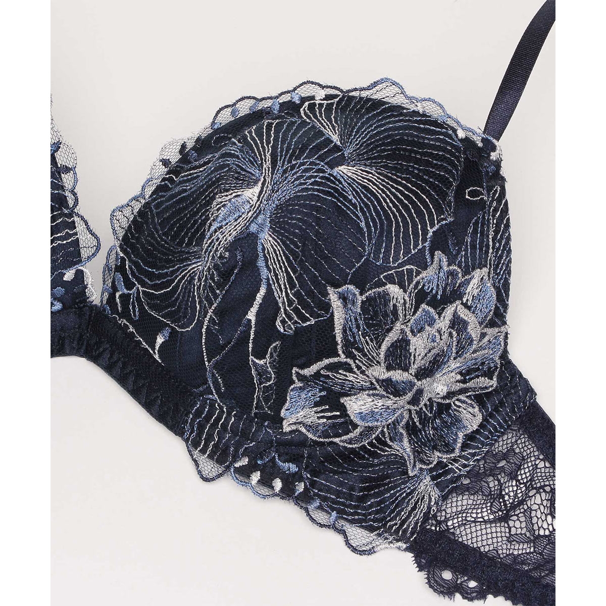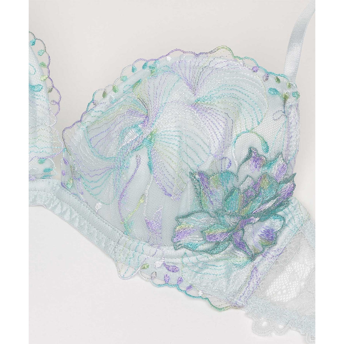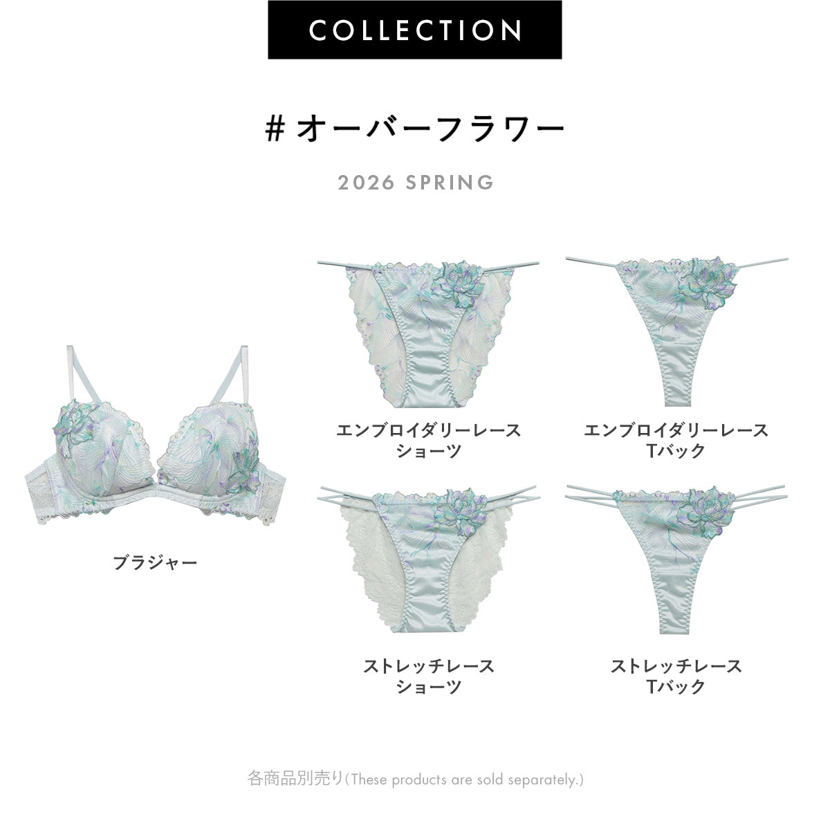 爛漫と咲き誇る季節を感じさせるコレクション【オーバーフラワー】。軽やかなチュールが、重なり溶け合うように広がる花を描く、可憐で華やかなデザインです。アシンメトリーに配置されたフラワーモチーフがアクセントに。煌めくマルチカラー刺繍のレースのグラデーションが美しいデザインです。