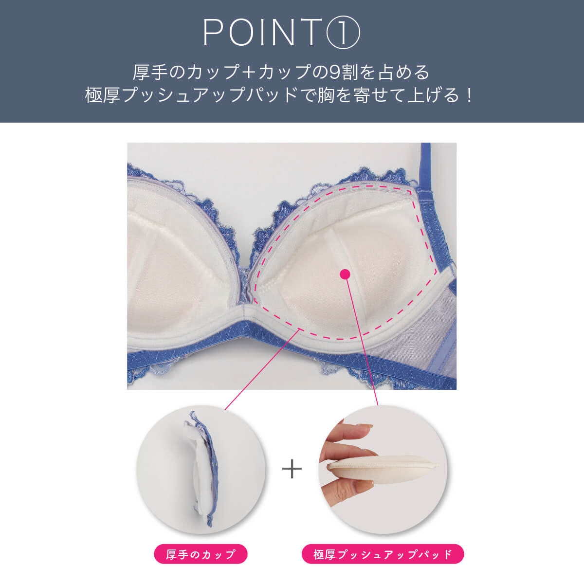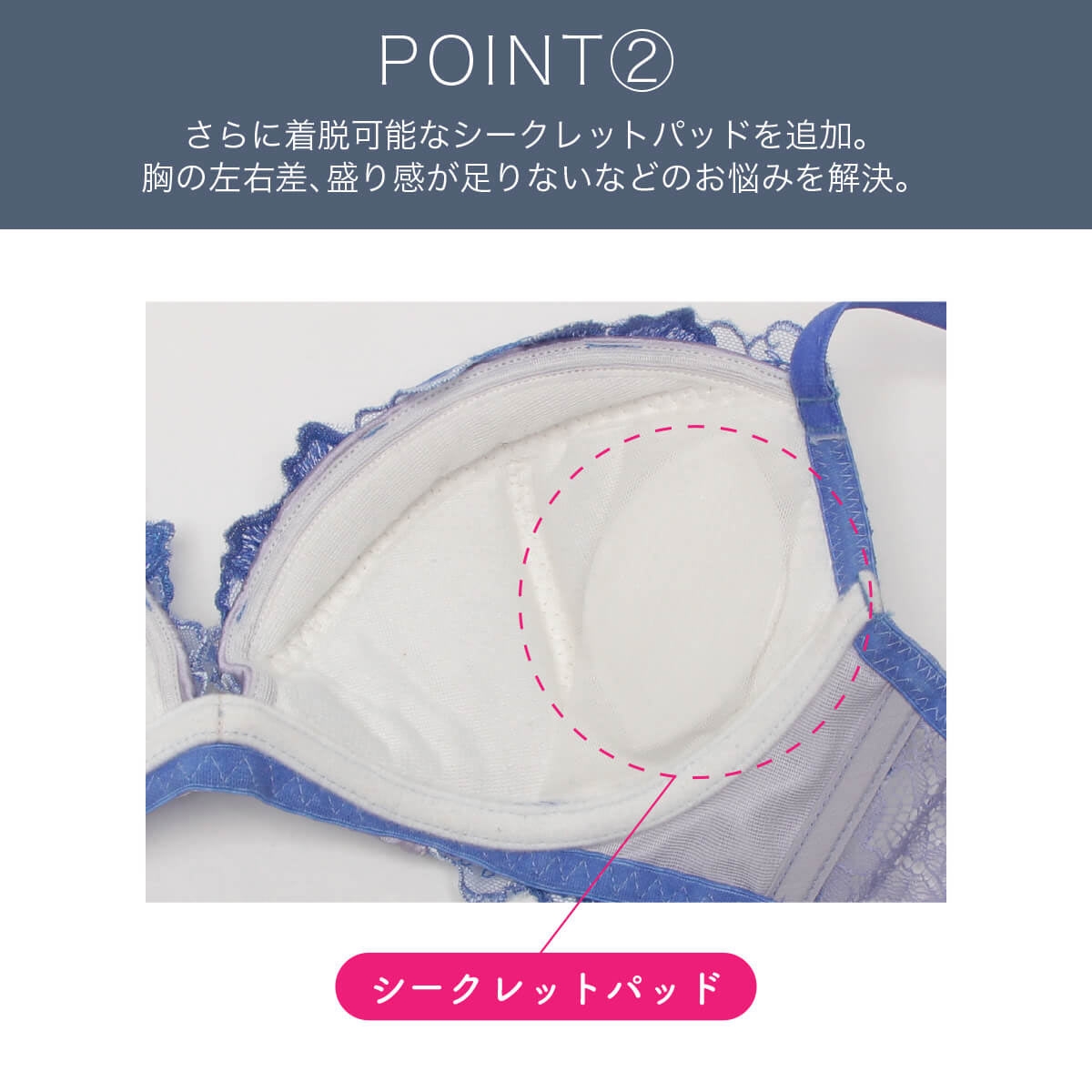 着脱可能なシークレットパッドも付属。胸の左右差の調整や「もう少し盛り感が欲しい」といったニーズに細かく対応。中心部分をフルカバーする構造で、グラマーバストも安定感がアップし、どんなバストサイズの方にも自信と美しさをもたらします。