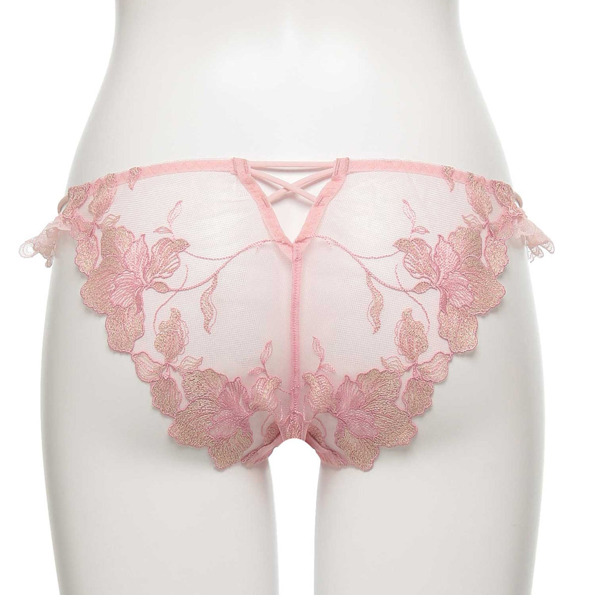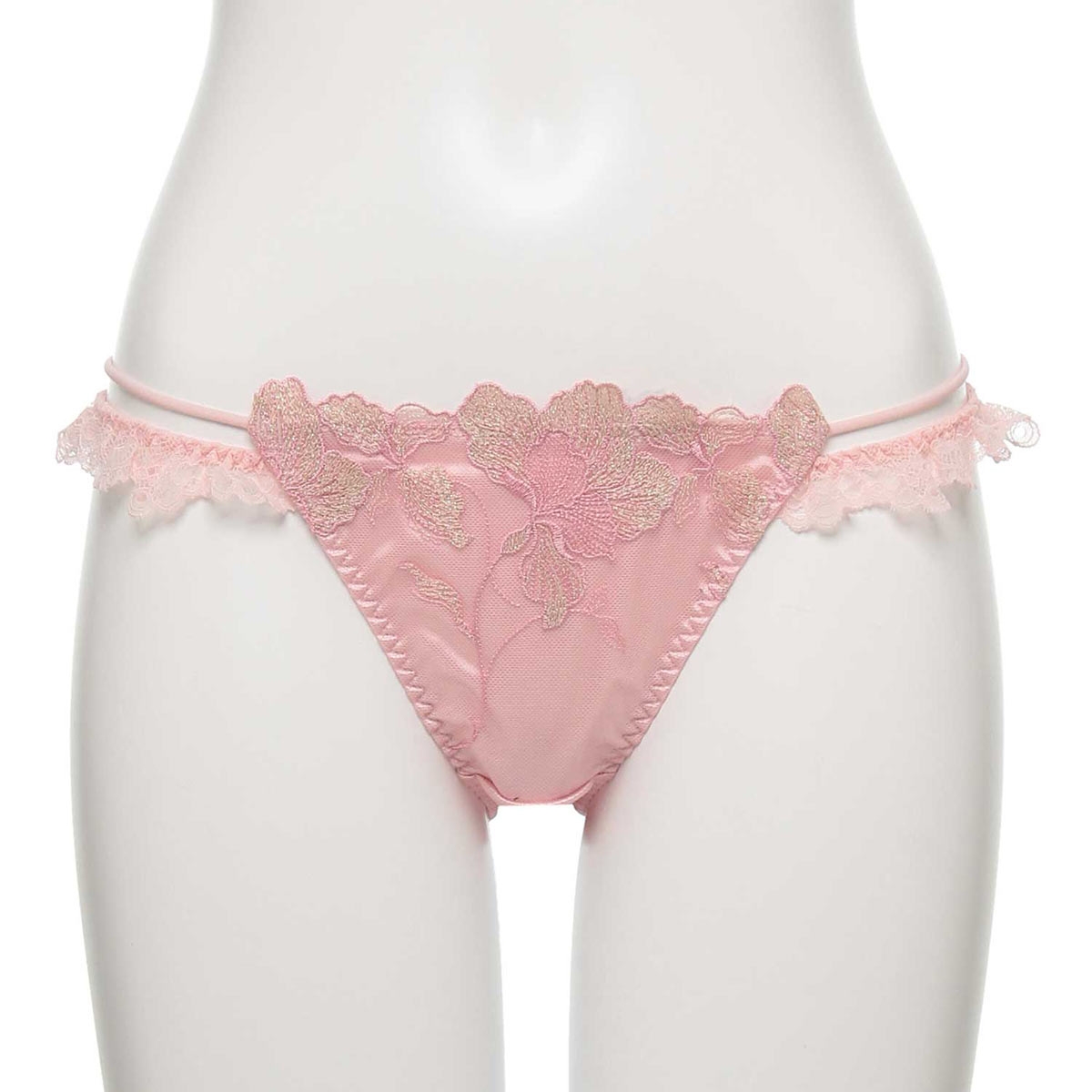 ラメが輝くエンブロイダリーレースが上品な色香を漂わせるノーマルショーツ。バックスタイルはレースを贅沢にあしらったゴージャスなデザイン。フリル×ストリングコードのダブル使いが、腰回りを華やかに演出します。フロントはサテンにレースを重ねた透けない仕様です。