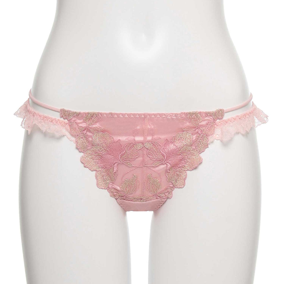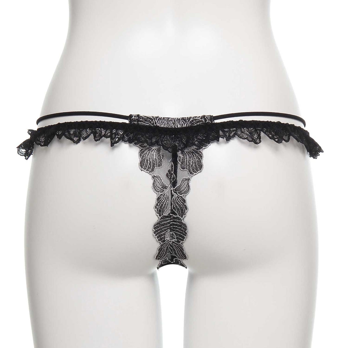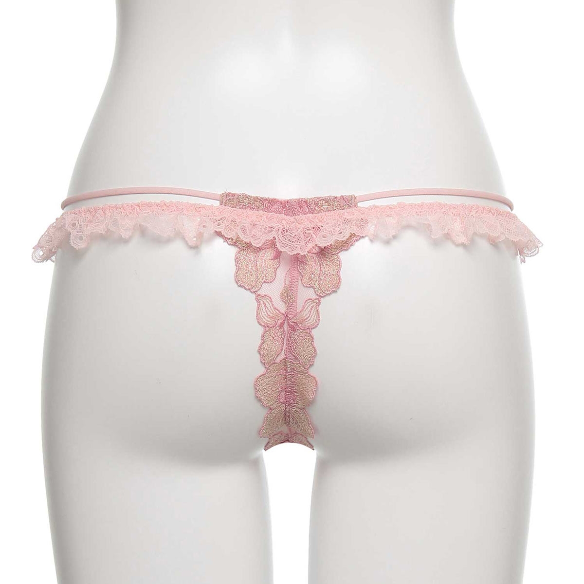 ラメが輝くエンブロイダリーレースが上品な色香を漂わせるTバックショーツ。バックスタイルはレースを贅沢にあしらったゴージャスなデザイン。フリル×ストリングコードのダブル使いが、腰回りを華やかに演出します。フロントはサテンにレースを重ねた透けない仕様です。