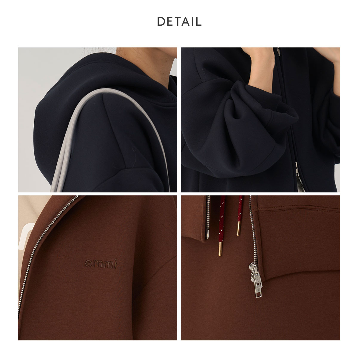 エミ定番のジップアップダンボールフーディーにemmiロゴ刺繍を施し、デザインをアップデート。