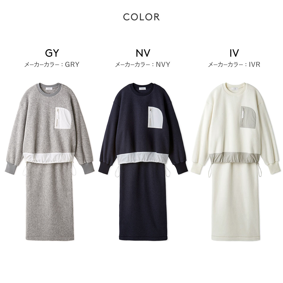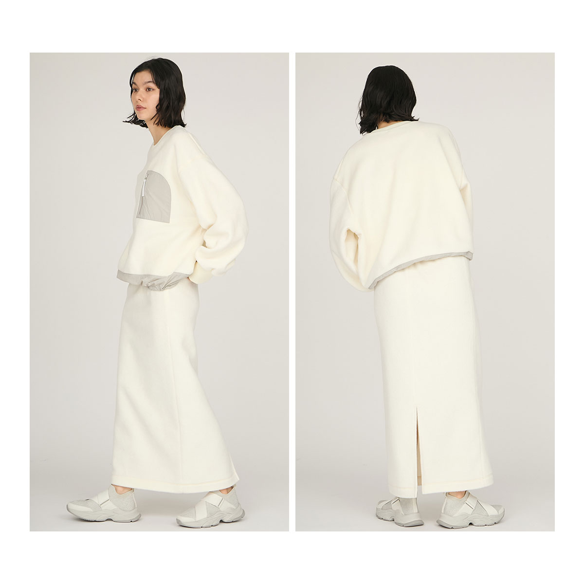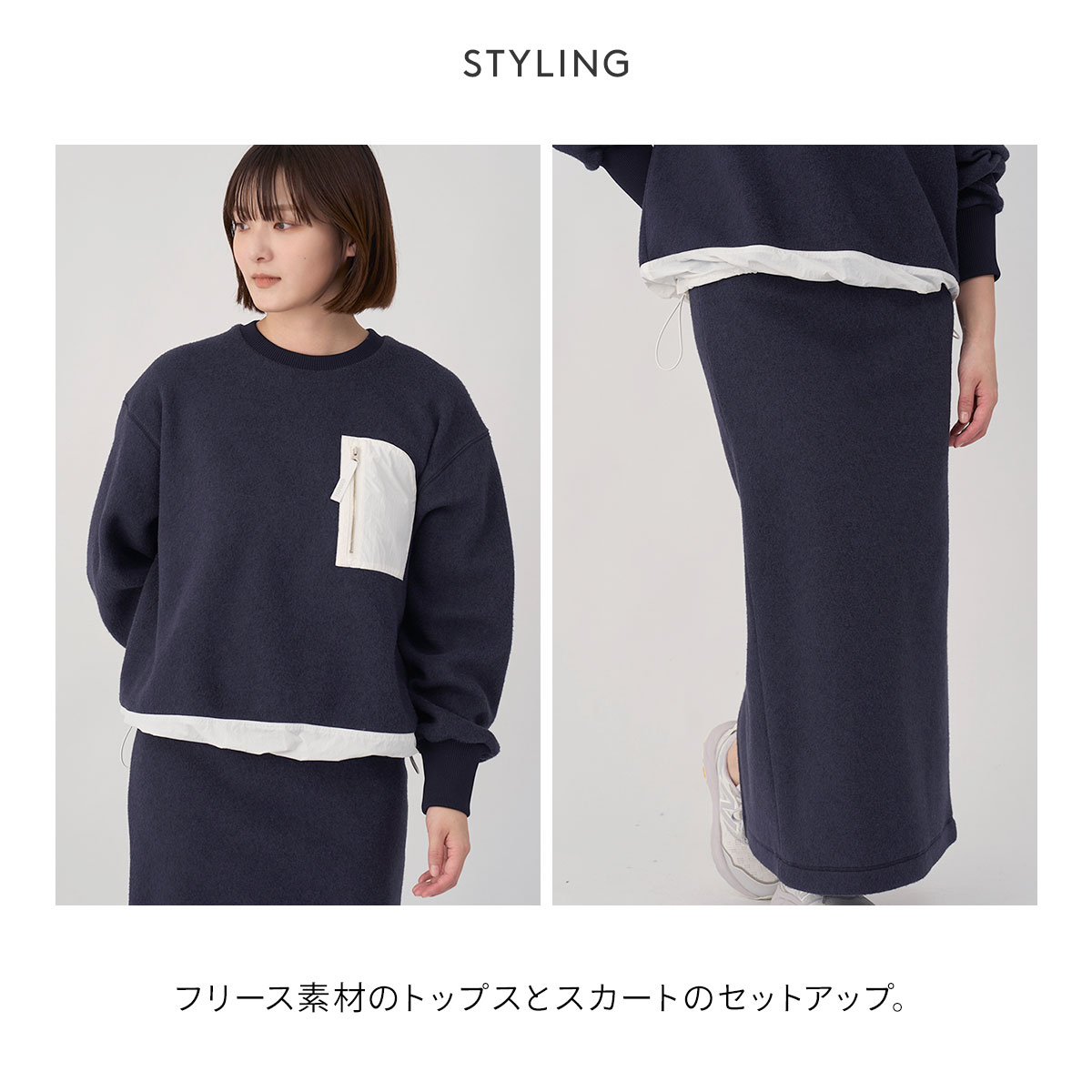 トップスのポケットや裾、スカートのウエスト部分はナイロン生地を使用することで、スポーティでモードなデザインに仕上げています。