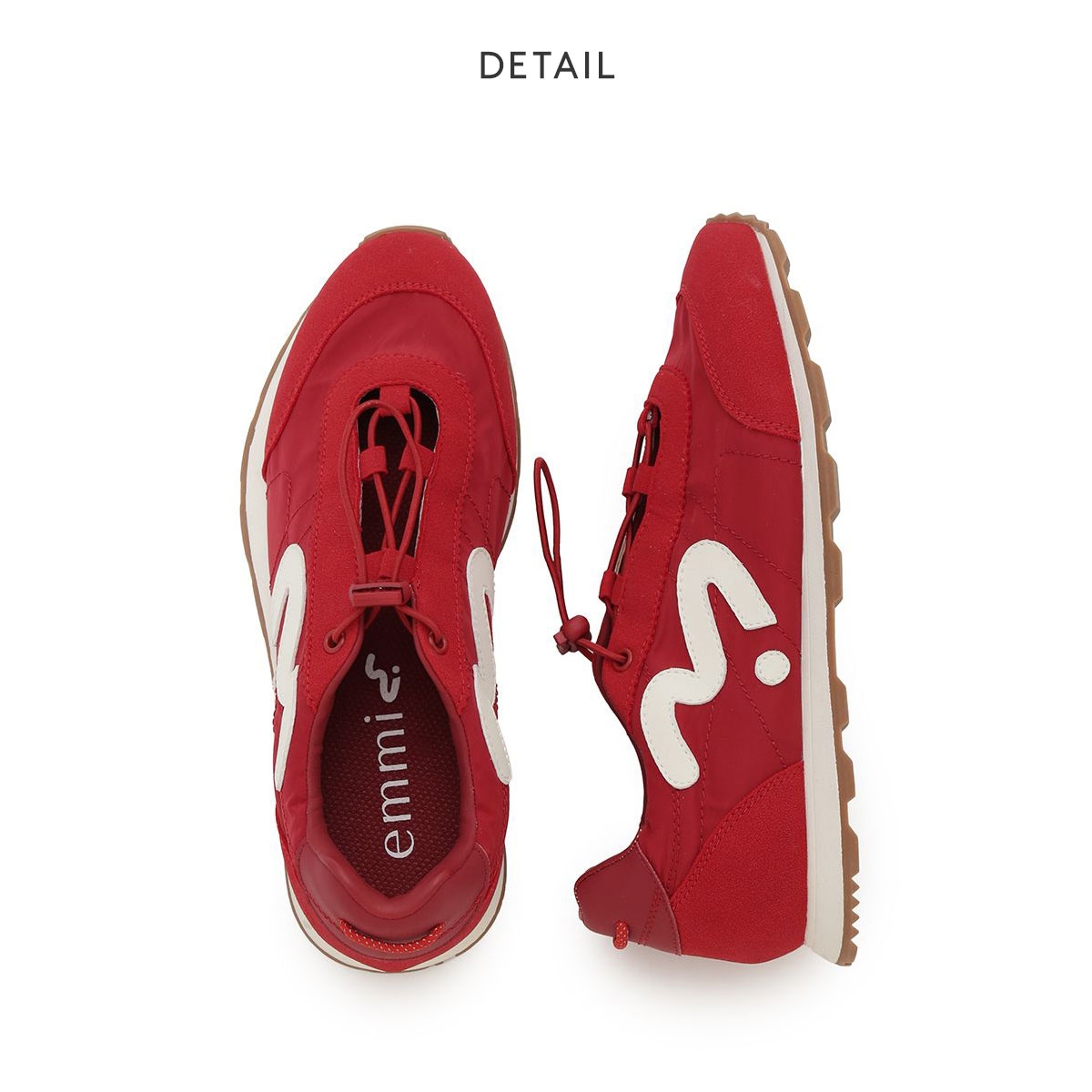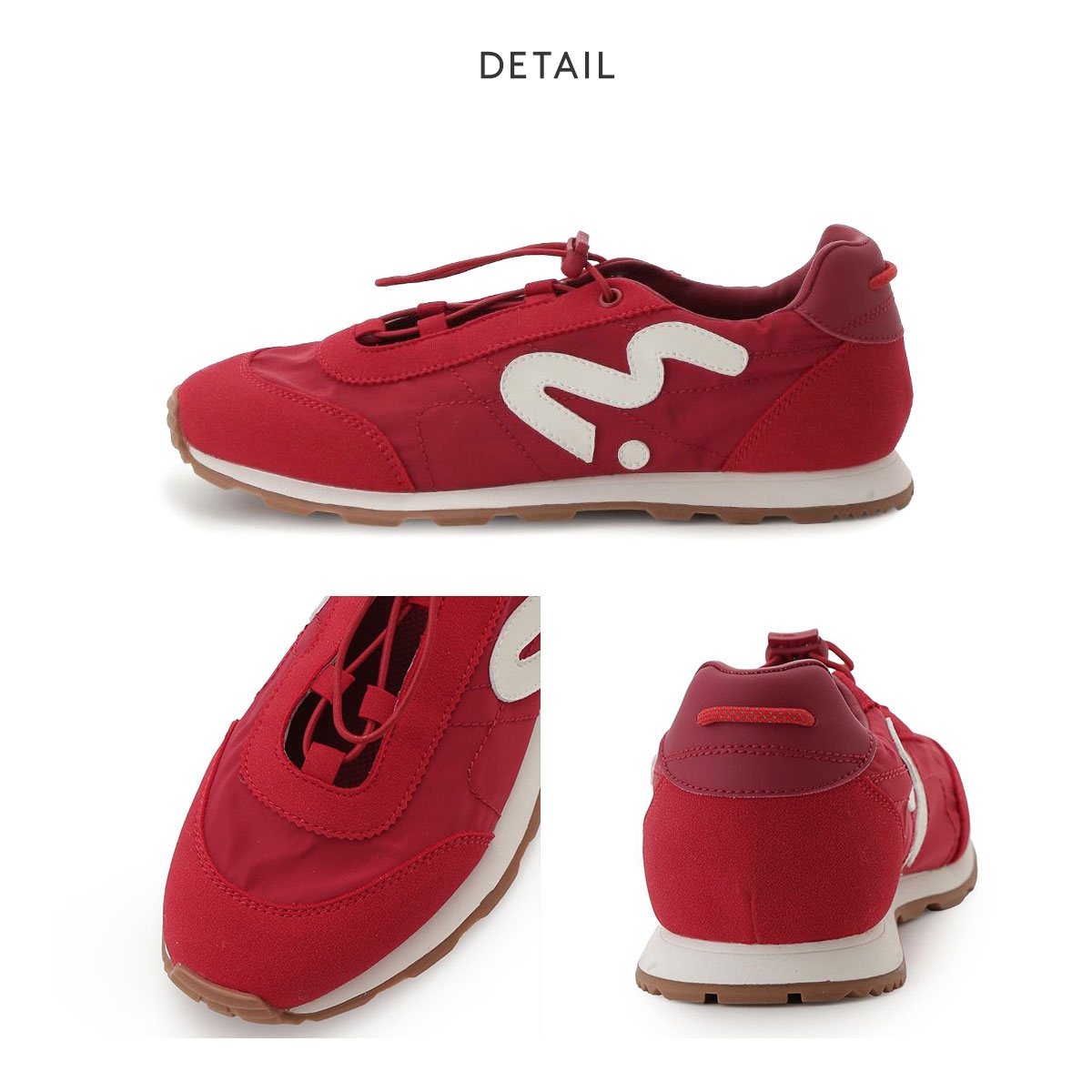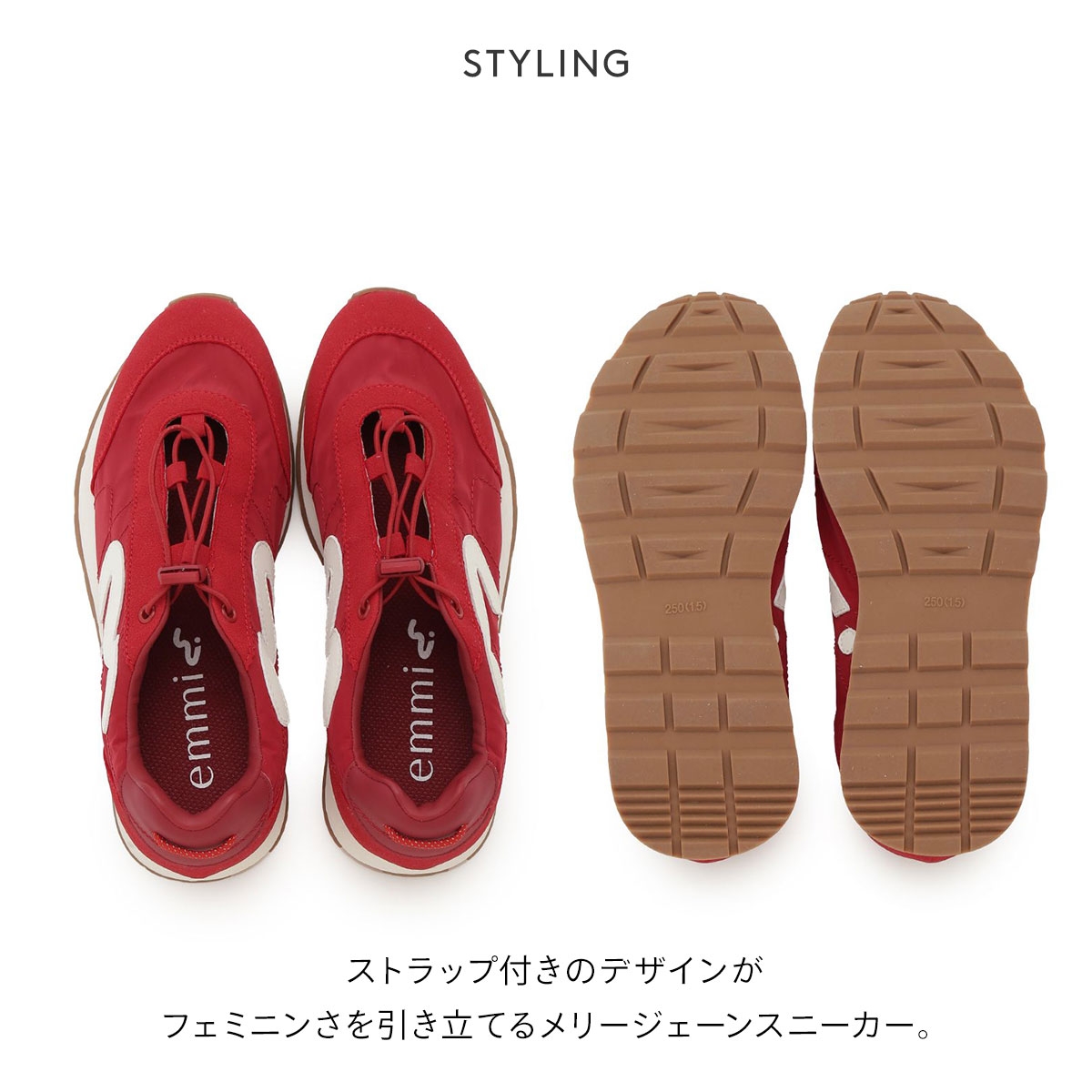 ブランドの新しいシンボルマーク「em(エム)」をあしらった、ストラップ付きのデザインがフェミニンさを引き立てるメリージェーンスニーカー。