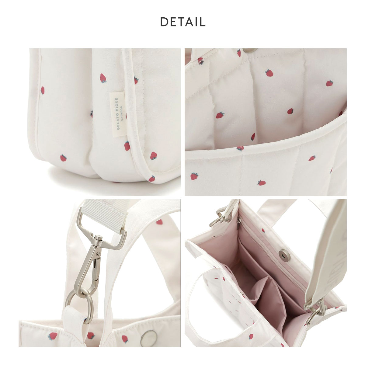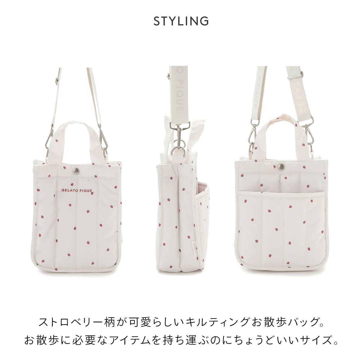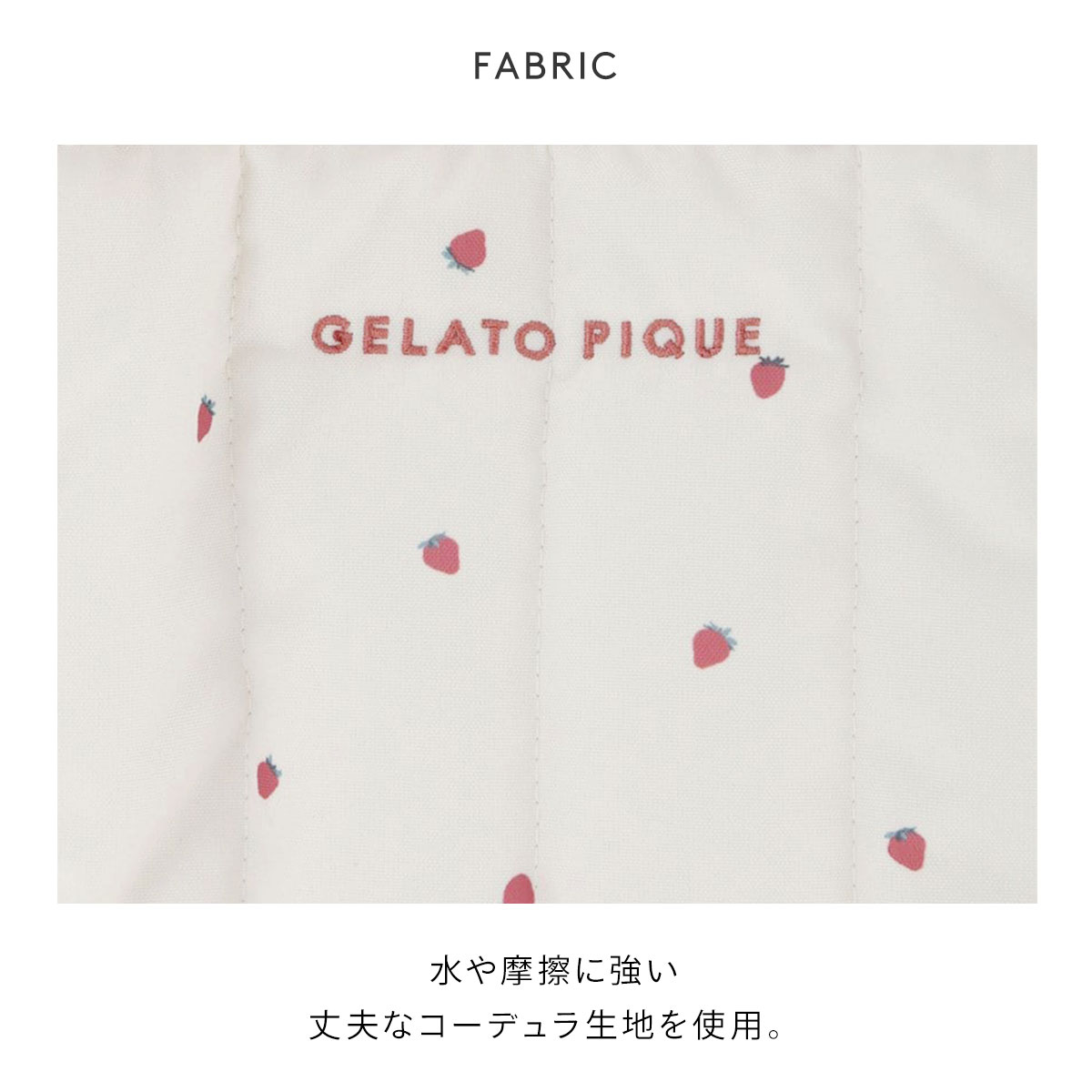 水や摩擦に強い、丈夫なコーデュラ生地を使用したお散歩バッグ。ストロベリー柄のキルティング素材でふんわりやわらかく仕上げています。