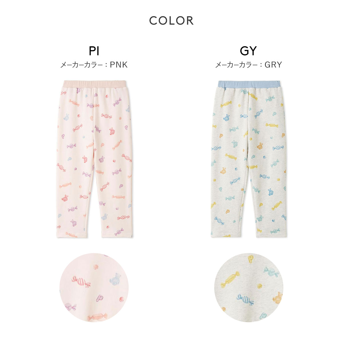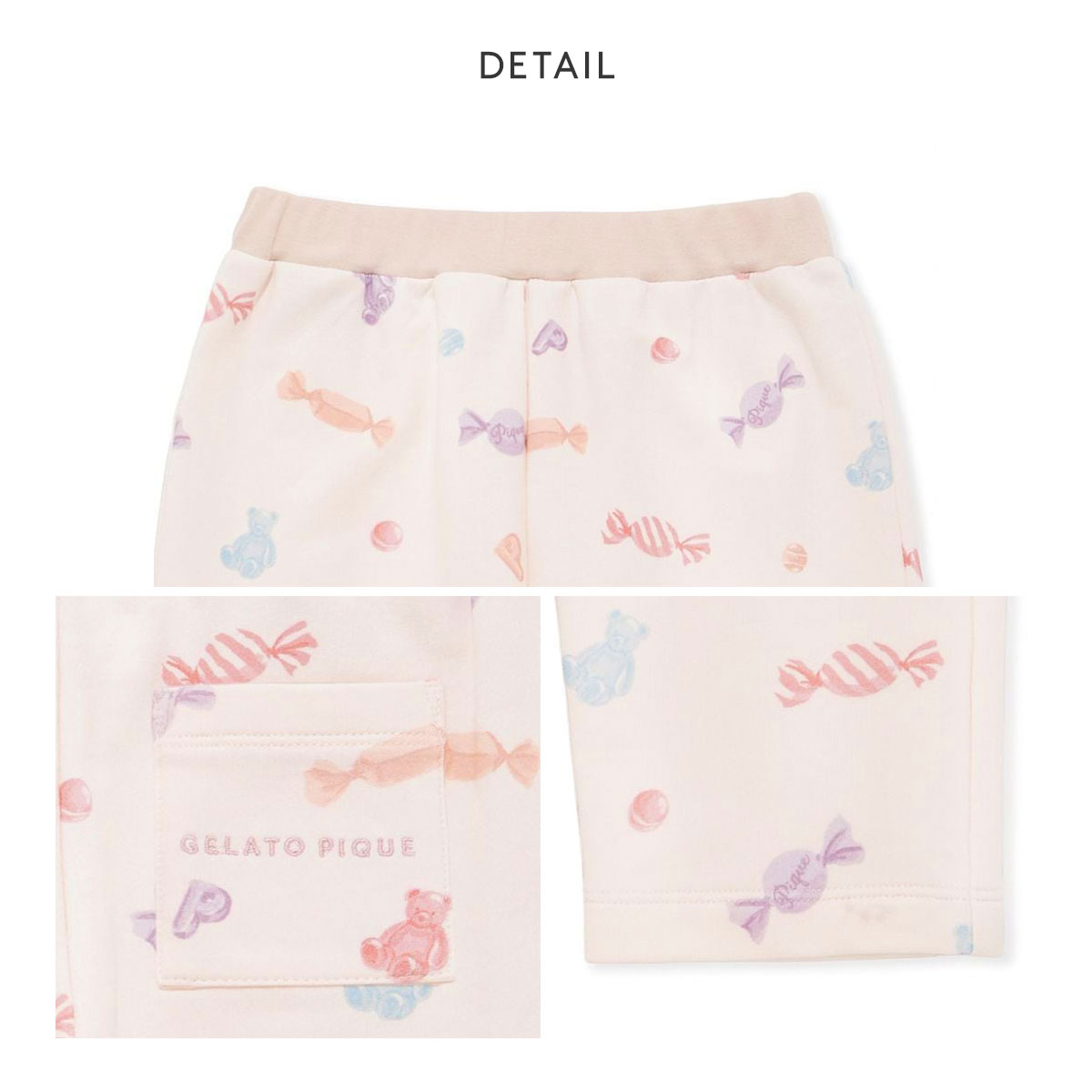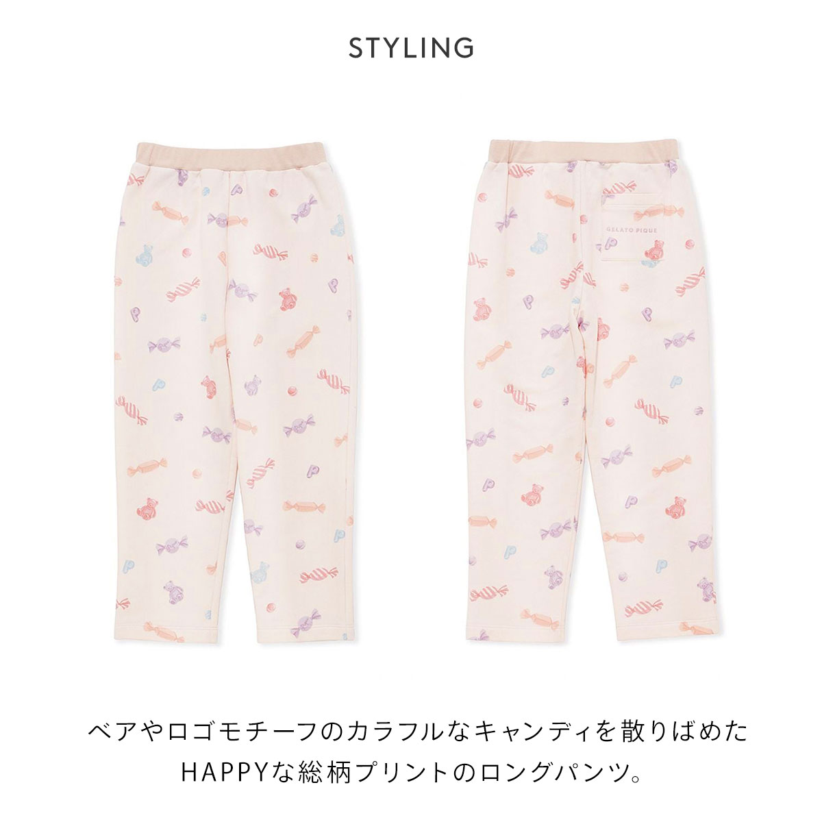 gelato piqueらしいベアやロゴモチーフのカラフルなキャンディを散りばめた、HAPPYな総柄プリントのキッズ用ロングパンツ。ウエストの配色デザインがポイントです。