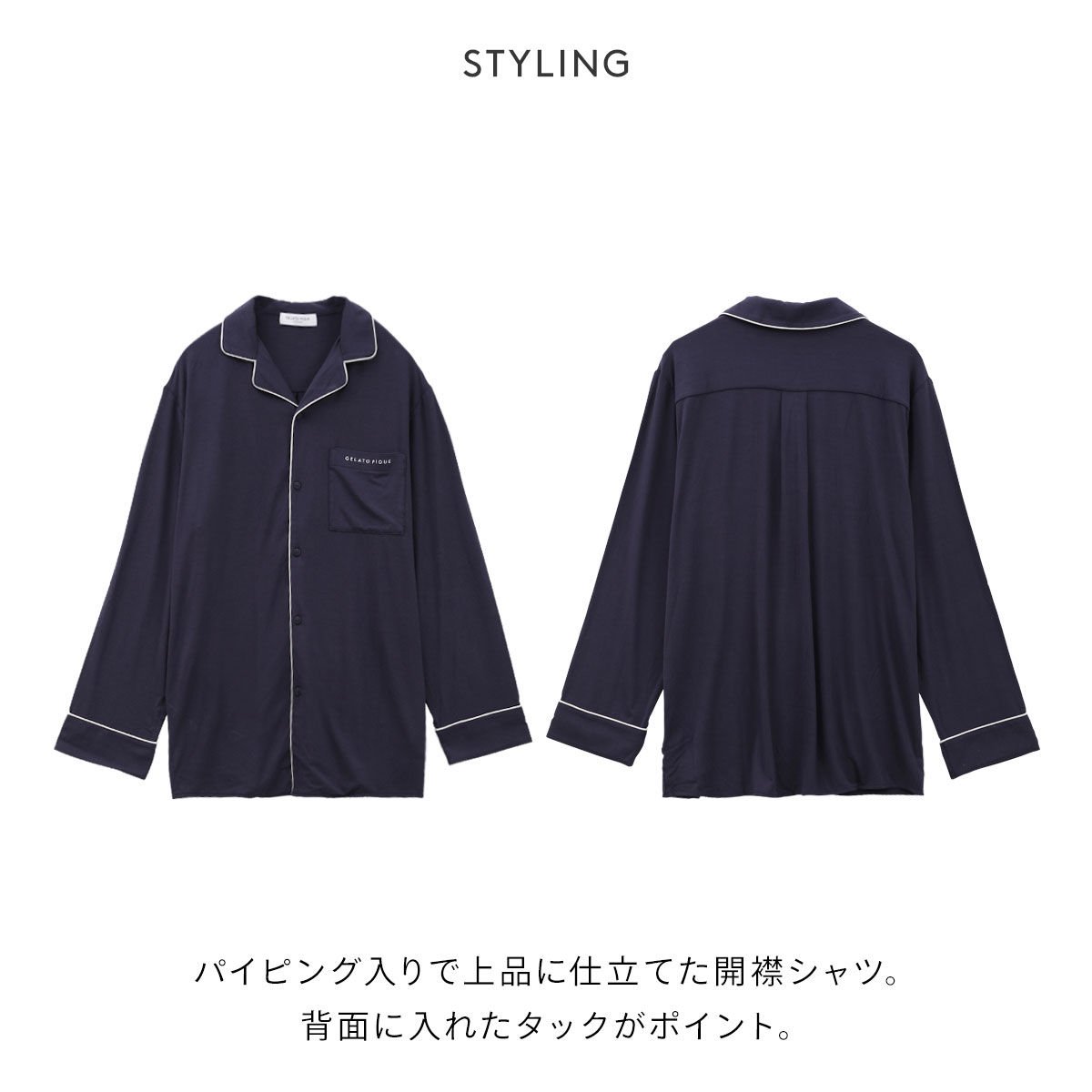 パイピング入りで上品に仕立てた開襟シャツ。背面に入れたタックがポイントです。