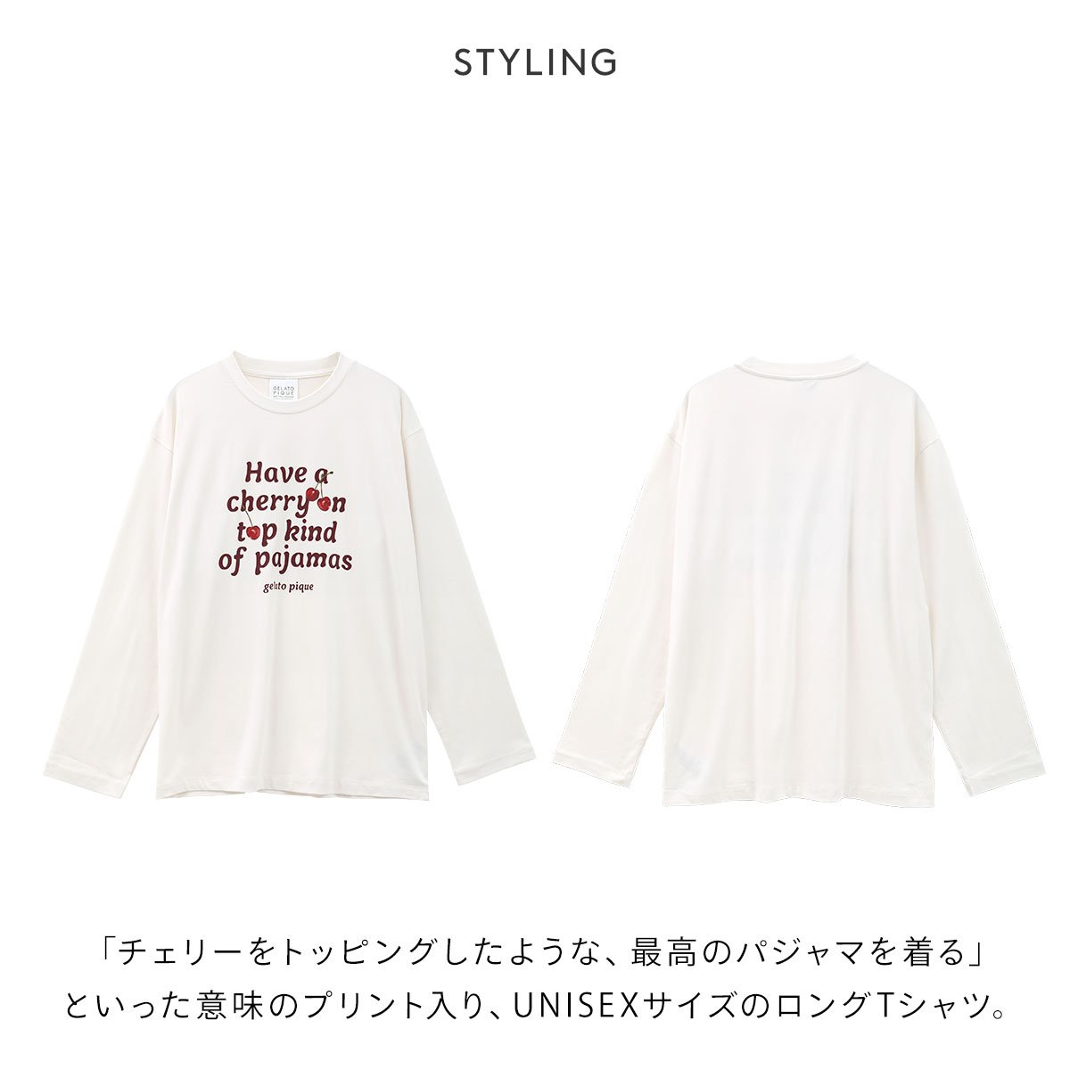 「チェリーをトッピングしたような、最高のパジャマを着る」といった意味のメッセージプリントを入れた、なめらかなUNISEXロングTシャツ。