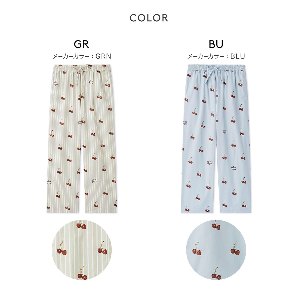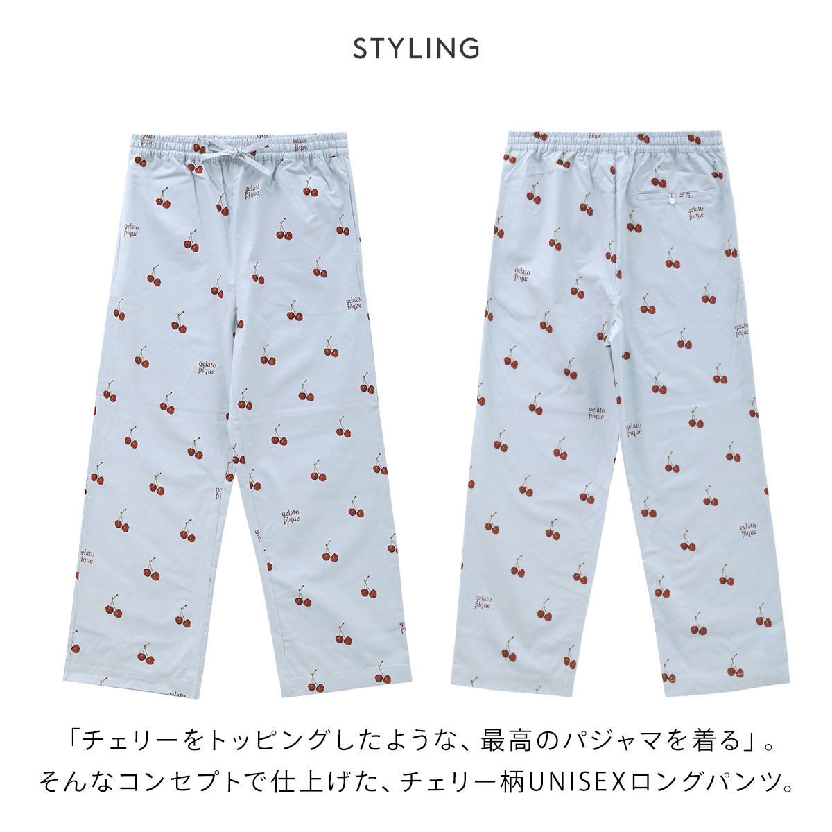 「チェリーをトッピングしたような、最高のパジャマを着る」。そんなコンセプトで仕上げた、甘すぎない色合いのチェリー柄UNISEXロングパンツ。