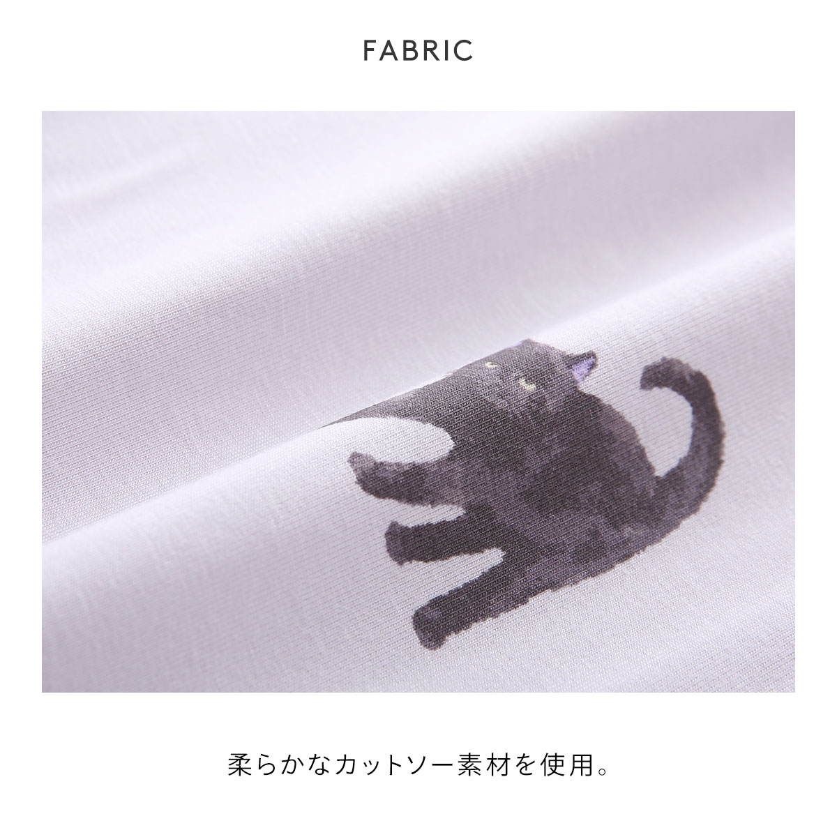 お座りポーズから、猫好きの方にはたまらない威嚇ポーズまで、表情豊かな黒猫を総柄プリントした、柔らかなカットソーロングパンツです。