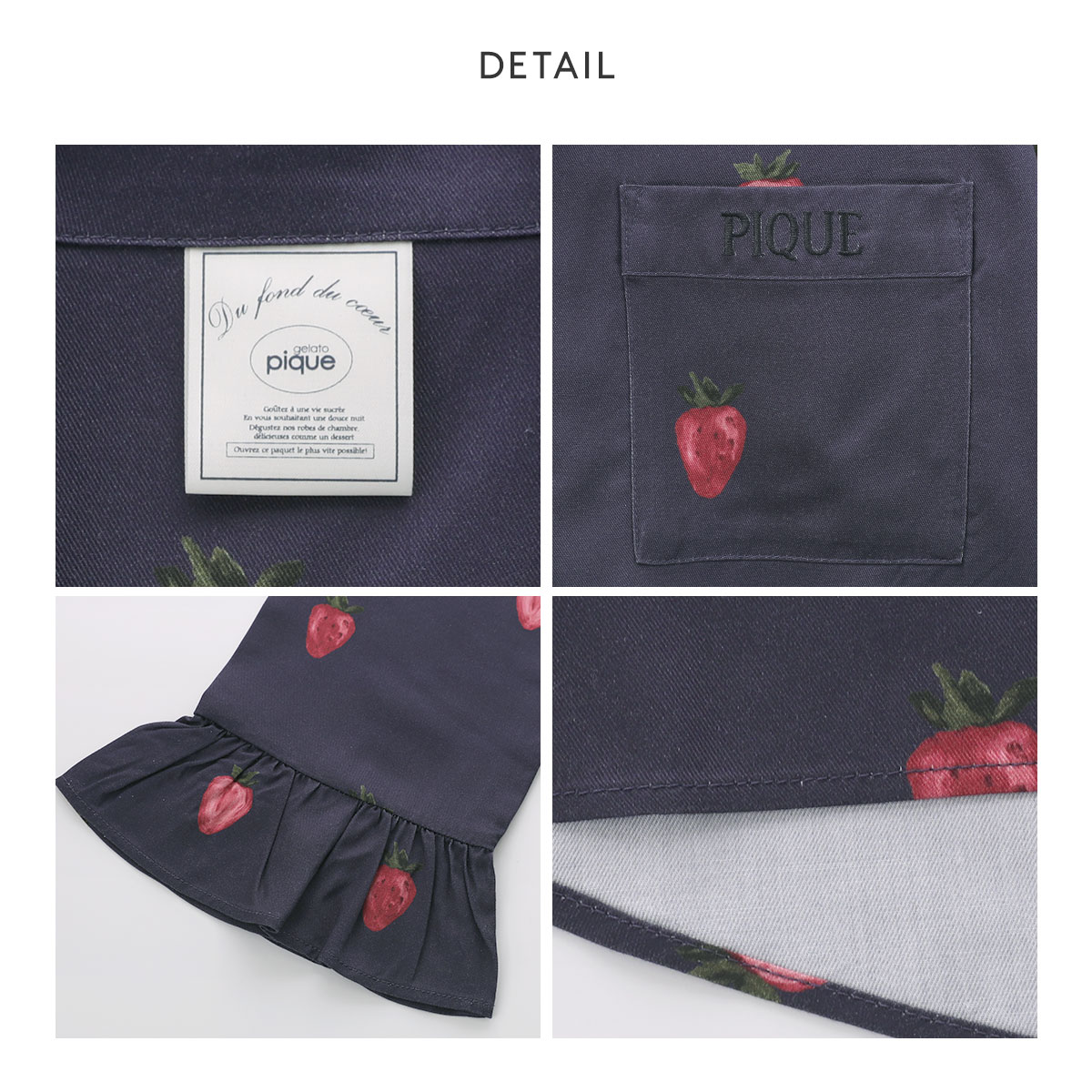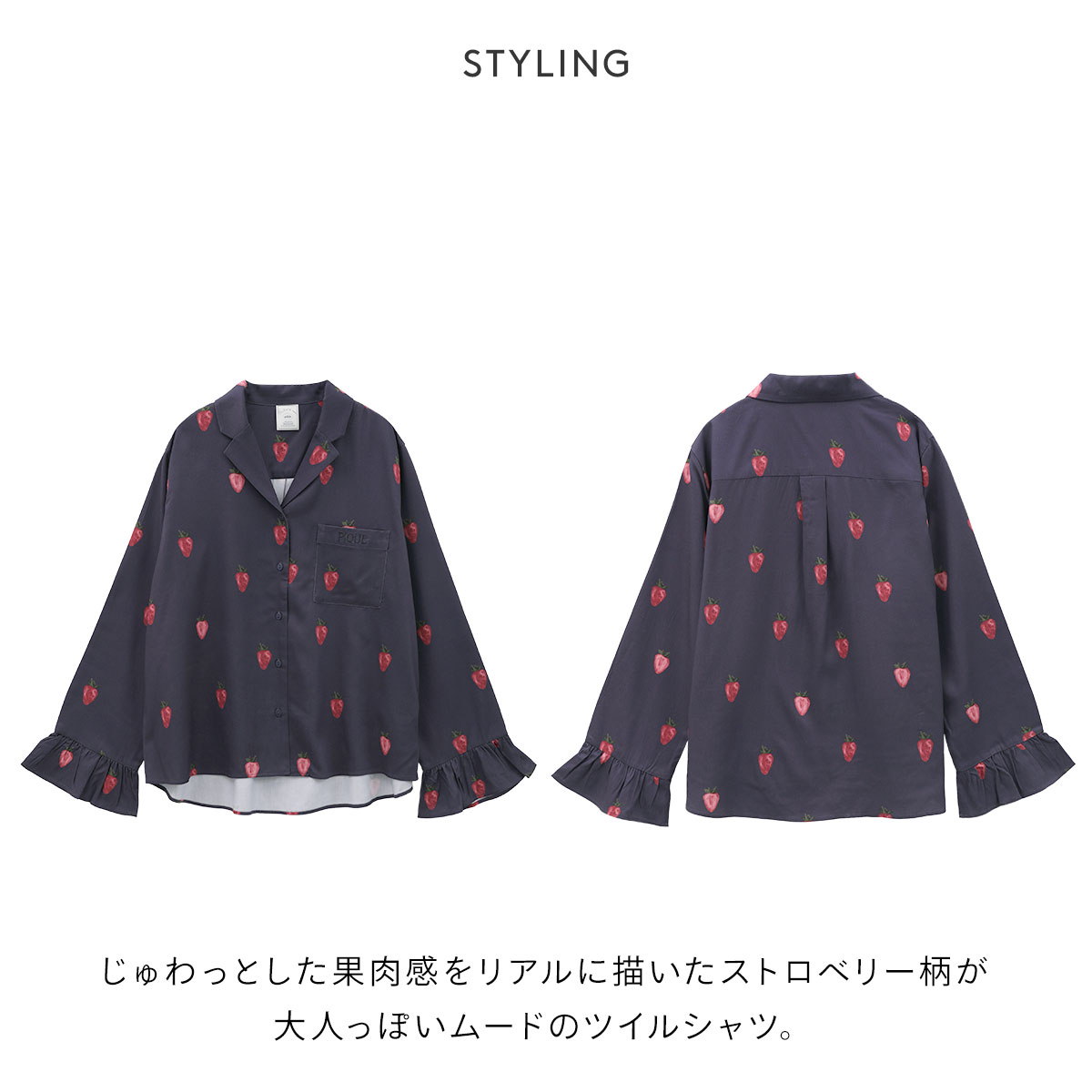 じゅわっとした果肉感をリアルに描いたストロベリー柄が大人っぽいムードのツイルシャツ。胸ポケットにはPIQUEのロゴ刺繍があしわれています。