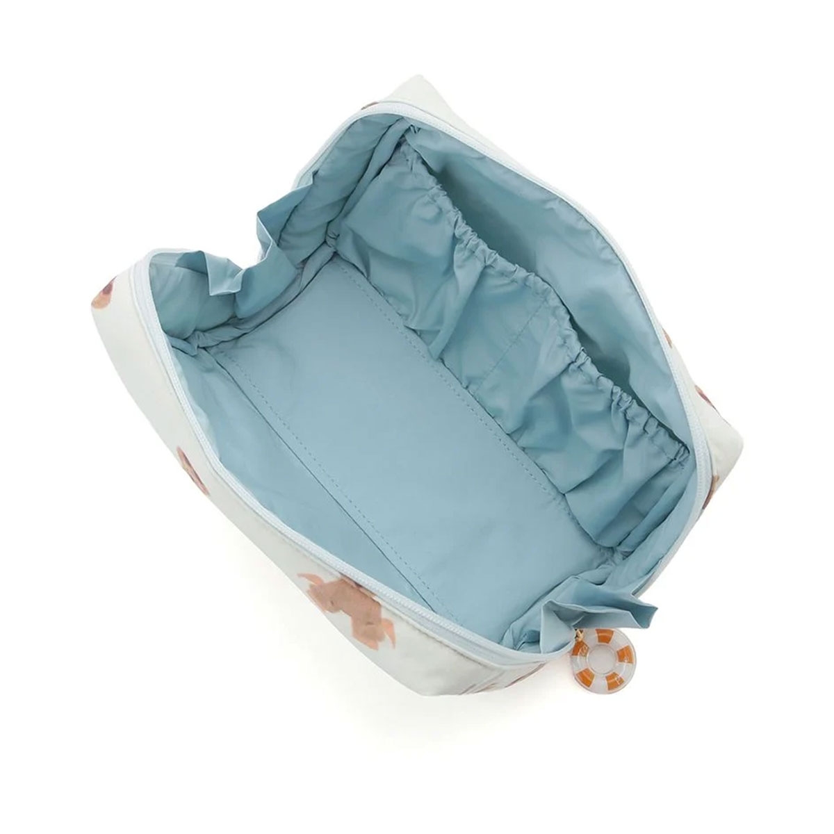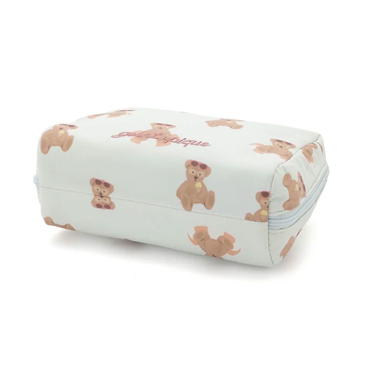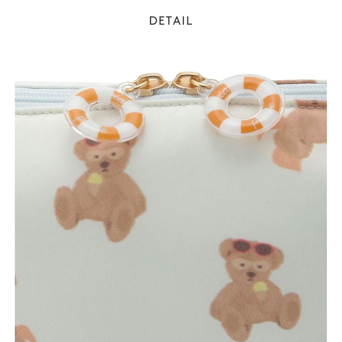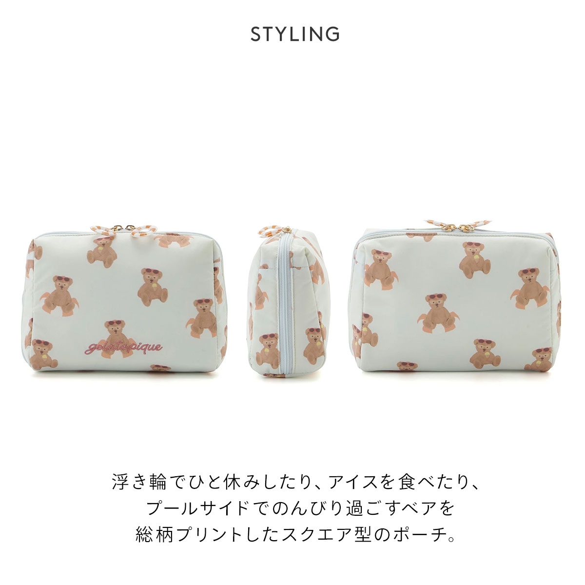 こちらは、浮き輪でひと休みしたり、アイスを食べたり、プールサイドでのんびり過ごすベアを総柄プリントしたスクエア型のポーチです。