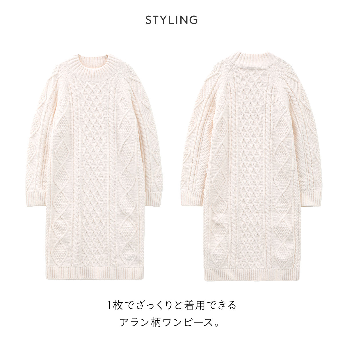 ふかふかと柔らかく、軽やかな肌触りのスフレ素材を使用したアラン柄ワンピース。