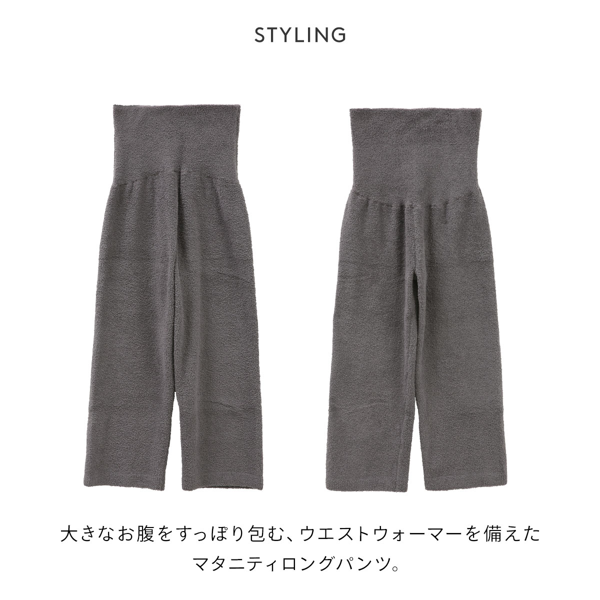 大きなお腹をすっぽり包む、ウエストウォーマーを備えたマタニティロングパンツ。